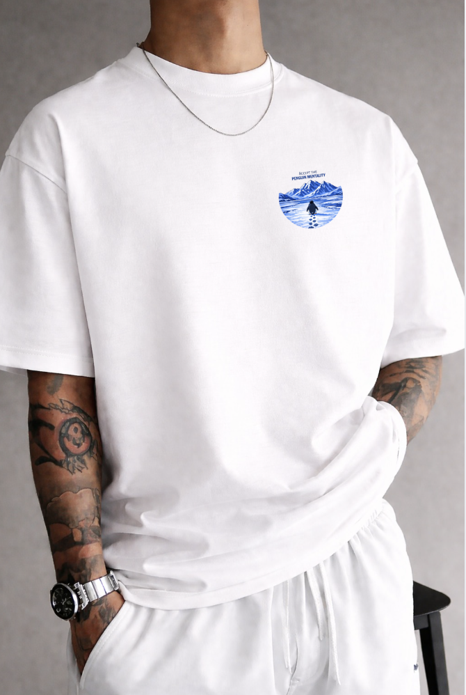 The minimalist front pocket graphic keeps things subtle, while the bold back artwork tells a deeper story: a lone penguin walking across icy terrain toward towering mountains — a symbol of patience, focus, and unshakable mindset. This piece isn’t just fashion; it’s a philosophy you wear.