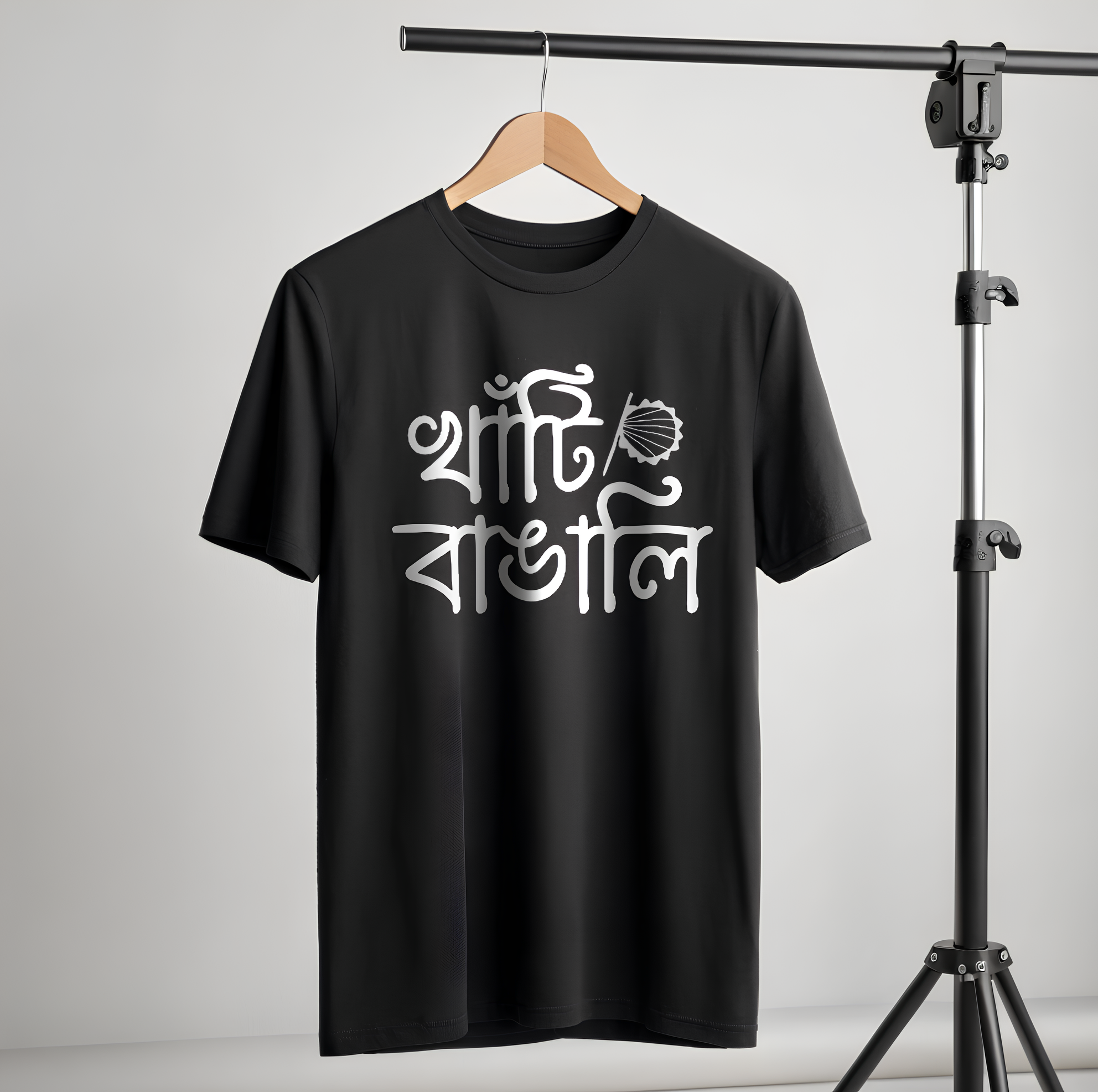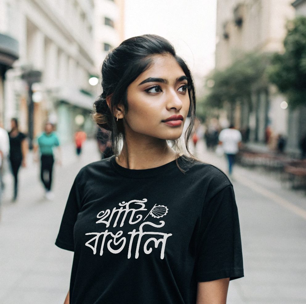 The Bengali text “শাঁতি বাঙালি” is creatively styled in a calligraphy-inspired font, giving it an artistic and cultural appeal. The clean white print contrasts perfectly with the black fabric, making the design pop without being overpowering.