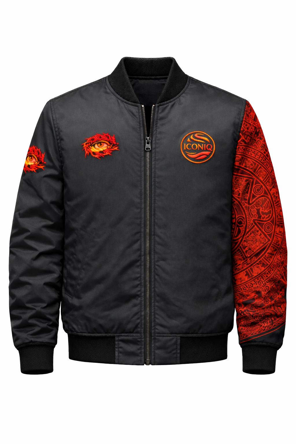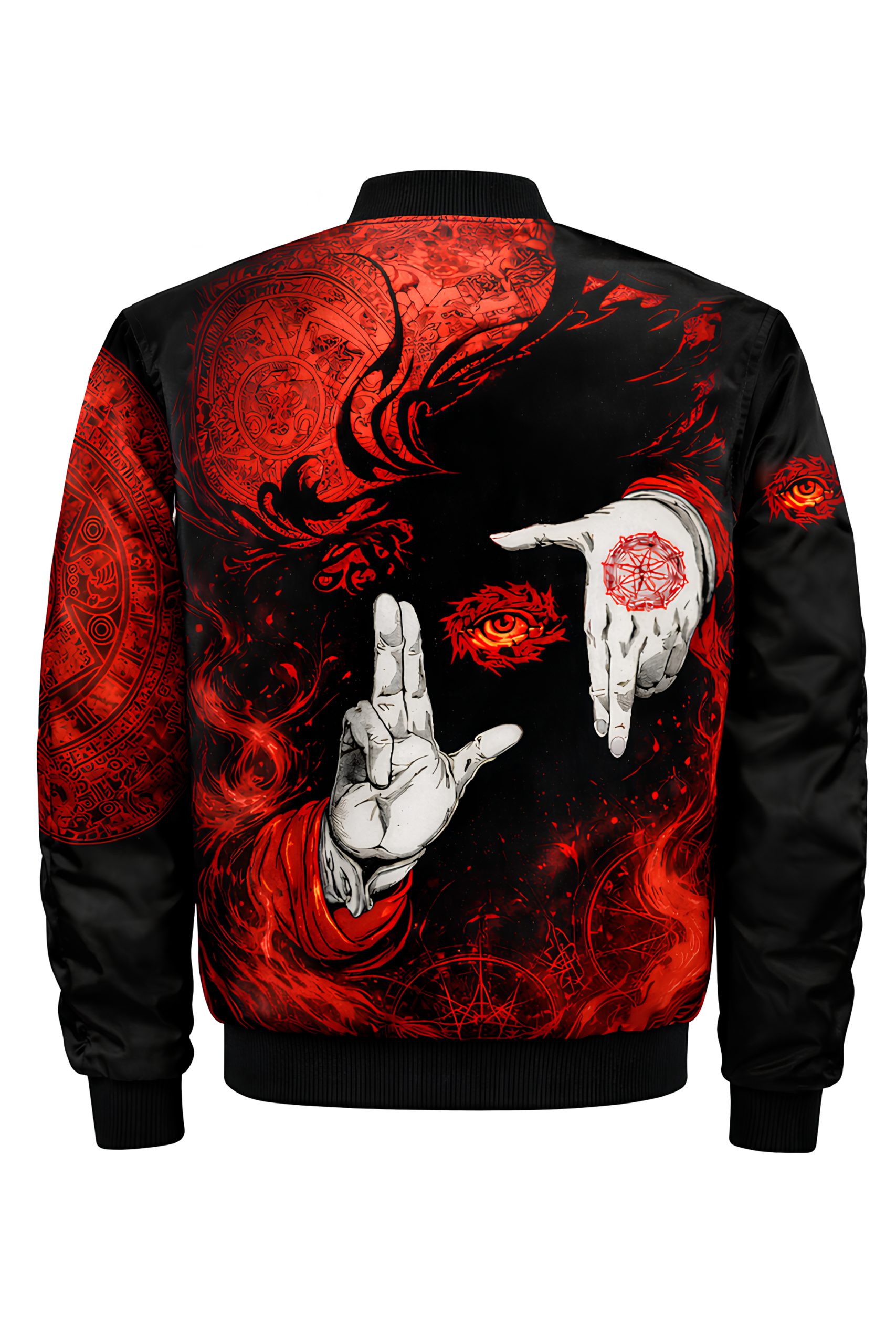 Unleash a bold statement with this high-impact graphic bomber jacket, crafted for those who embrace mystery, power, and fearless style. Designed to command attention, this jacket blends dark occult symbolism, fiery red artwork, and deep black contrast into a striking wearable masterpiece.