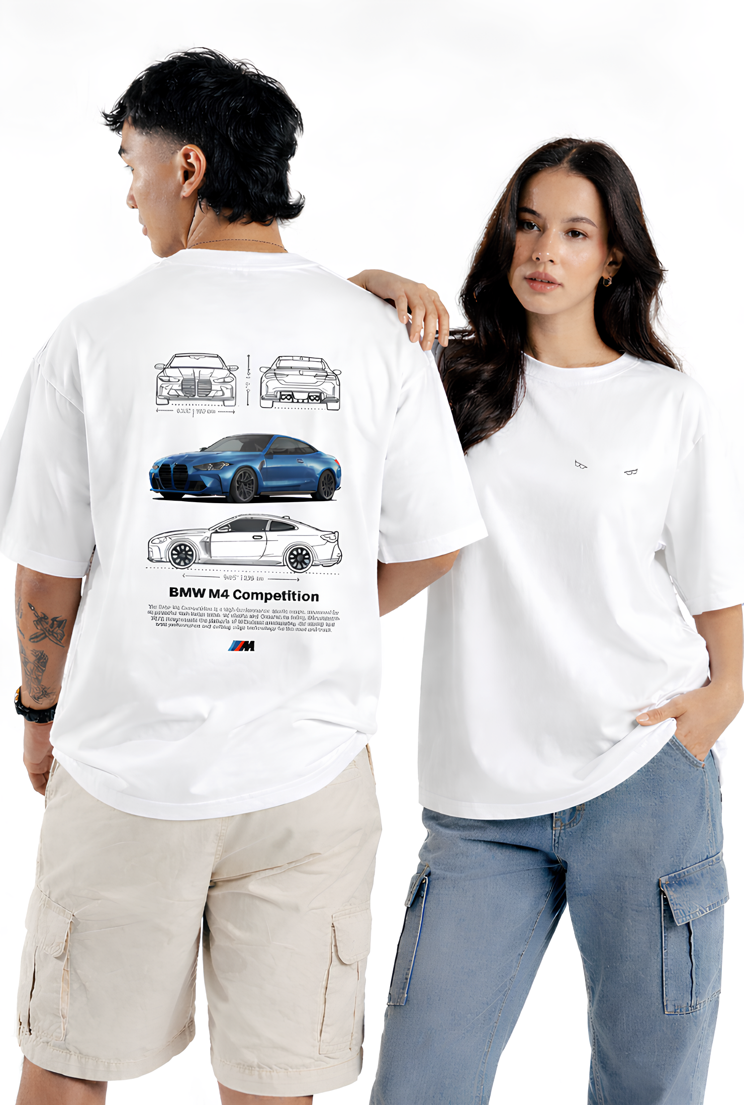 The back of the shirt features a striking BMW M4 Competition blueprint-style layout, including front and rear technical sketches along with a bold full-color side view of the iconic performance coupe. The design highlights the aggressive styling and precision lines that make the M4 a legend in the sports car world. Clean technical drawings and subtle detailing create a sophisticated automotive-inspired look.