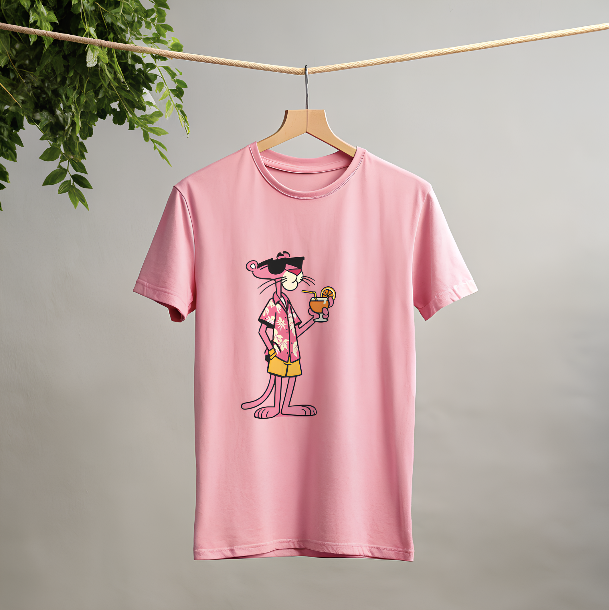 • Step into effortless style and relaxed comfort with this pastel pink graphic T-shirt, featuring a playful, cool cartoon-inspired design that instantly uplifts your look. The illustration shows a chilled-out character wearing a tropical shirt and sunglasses, holding a refreshing drink — perfect for anyone who loves summer aesthetics, vacation vibes, and laid-back fashion.