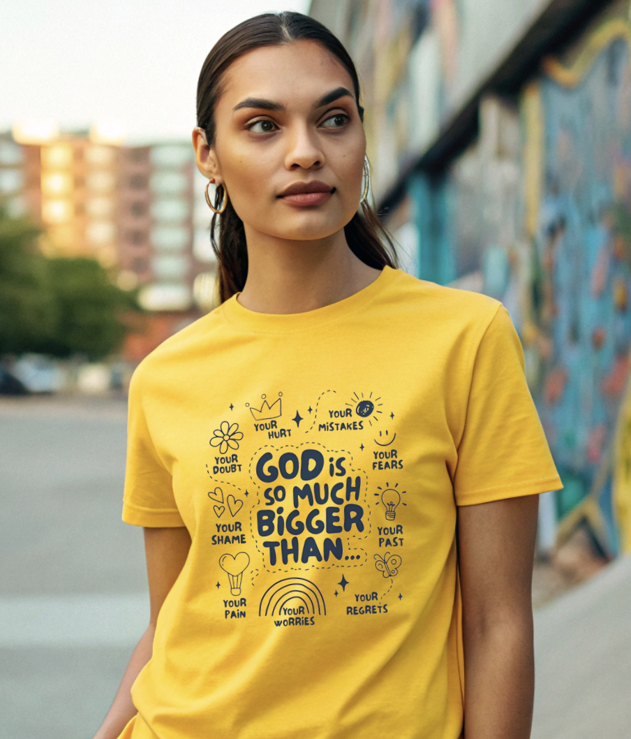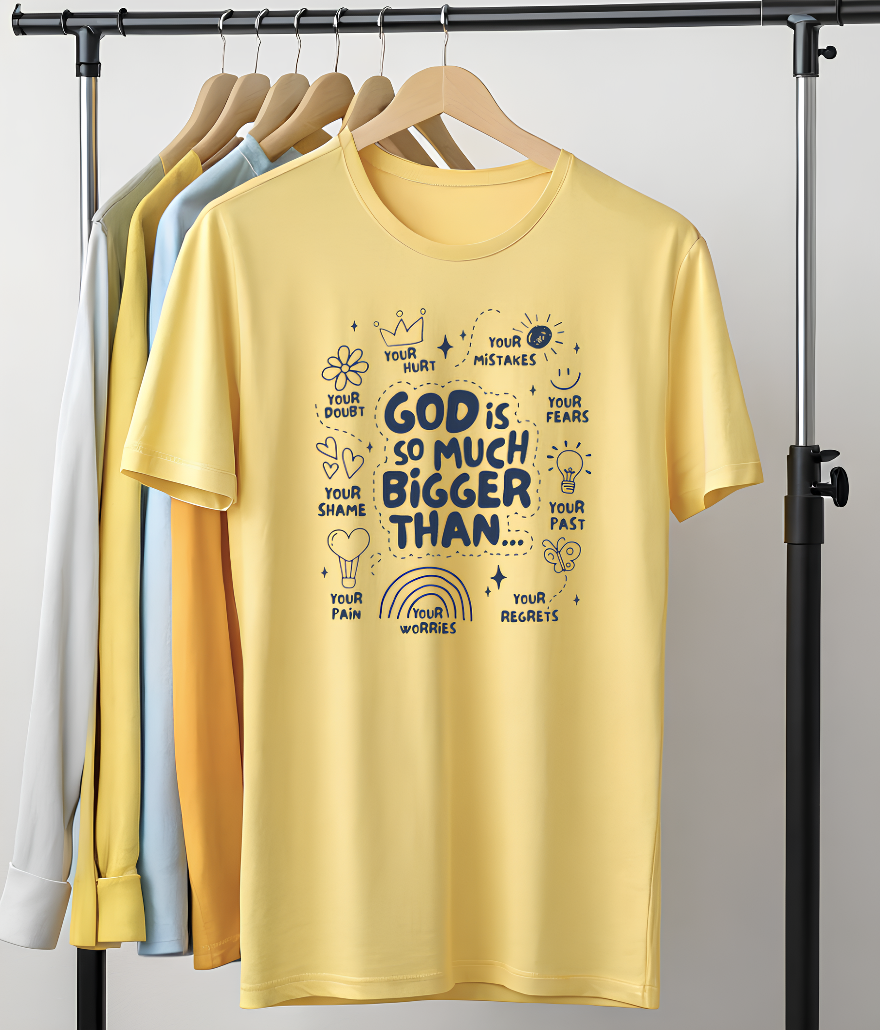 - Embrace faith, comfort, and positivity with this uplifting “God Is So Much Bigger” t-shirt. Designed to remind you of God’s power over life’s struggles, this tee features a beautifully illustrated message: