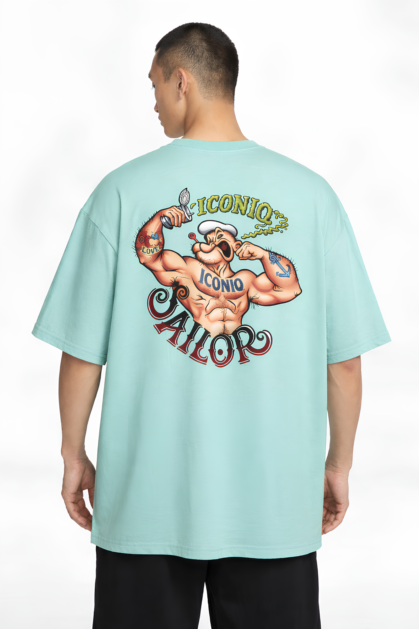 The back of the T-shirt showcases a large, eye-catching illustration of a muscular sailor character with classic tattoo details and bold typography that reads “ICONIQ SAILOR.” The design delivers a retro tattoo-art vibe with modern streetwear energy, making it a perfect choice for trendsetters who want their outfit to stand out. On the front chest, a smaller version of the graphic adds a balanced and stylish touch, keeping the look minimal yet distinctive.