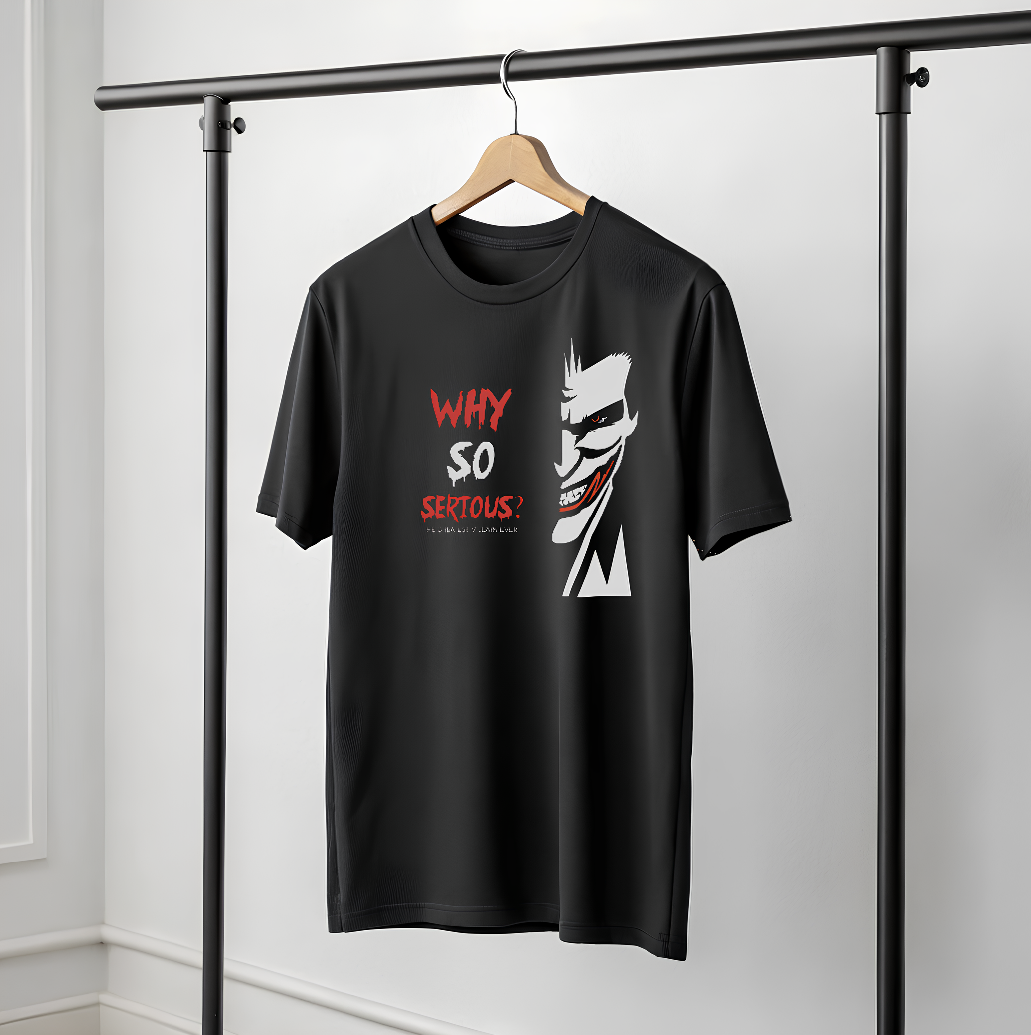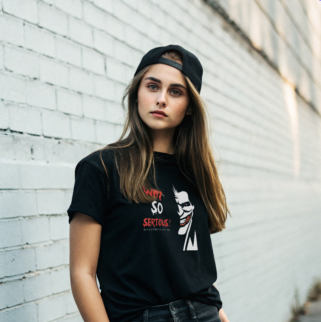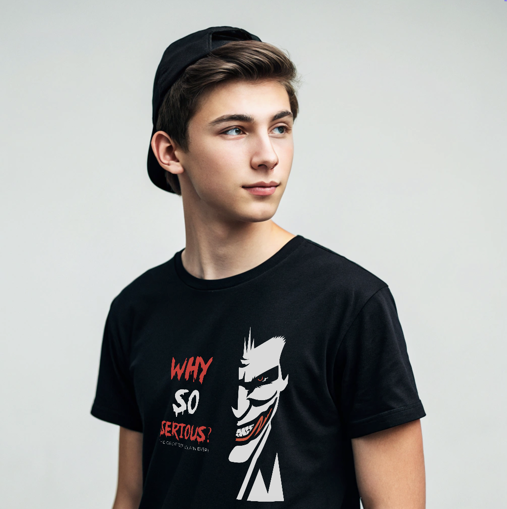 • Make a bold statement with this eye-catching graphic T-shirt that blends edgy attitude with modern streetwear style. Featuring the iconic phrase “WHY SO SERIOUS?” in a distressed red-and-white font and a striking half-face illustration with a mischievous grin, this tee is perfect for anyone who loves bold art, dark humor, and pop-culture inspired designs.