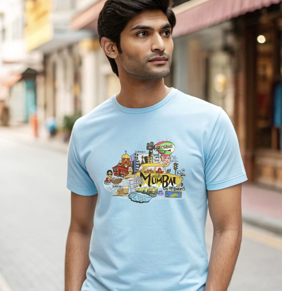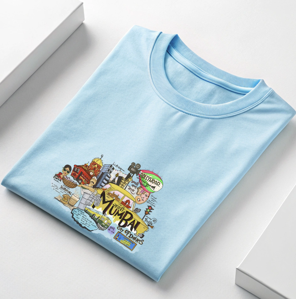 The design captures the essence of Mumbai through colorful, hand-drawn illustrations—Bollywood glamour, iconic local trains, the Gateway of India, bustling streets, and the city’s timeless energy. With its playful yet detailed artwork, the T-shirt reflects Mumbai’s culture, diversity, and unbreakable spirit of survival.