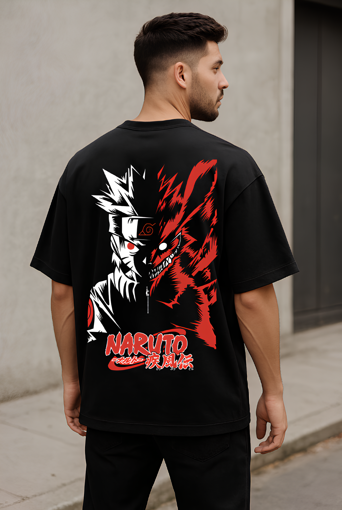 Unleash your inner shinobi with this Naruto Oversized Graphic Tee, a bold tribute to one of anime’s most legendary series. Designed for true fans, this black streetwear T-shirt features a striking split-face graphic of Naruto Uzumaki and Kurama (Nine-Tails) — symbolizing power, resilience, and the unbreakable bond between man and beast. The vivid red and white print contrasts sharply against the deep black fabric, creating a dynamic and fierce aesthetic that stands out effortlessly.