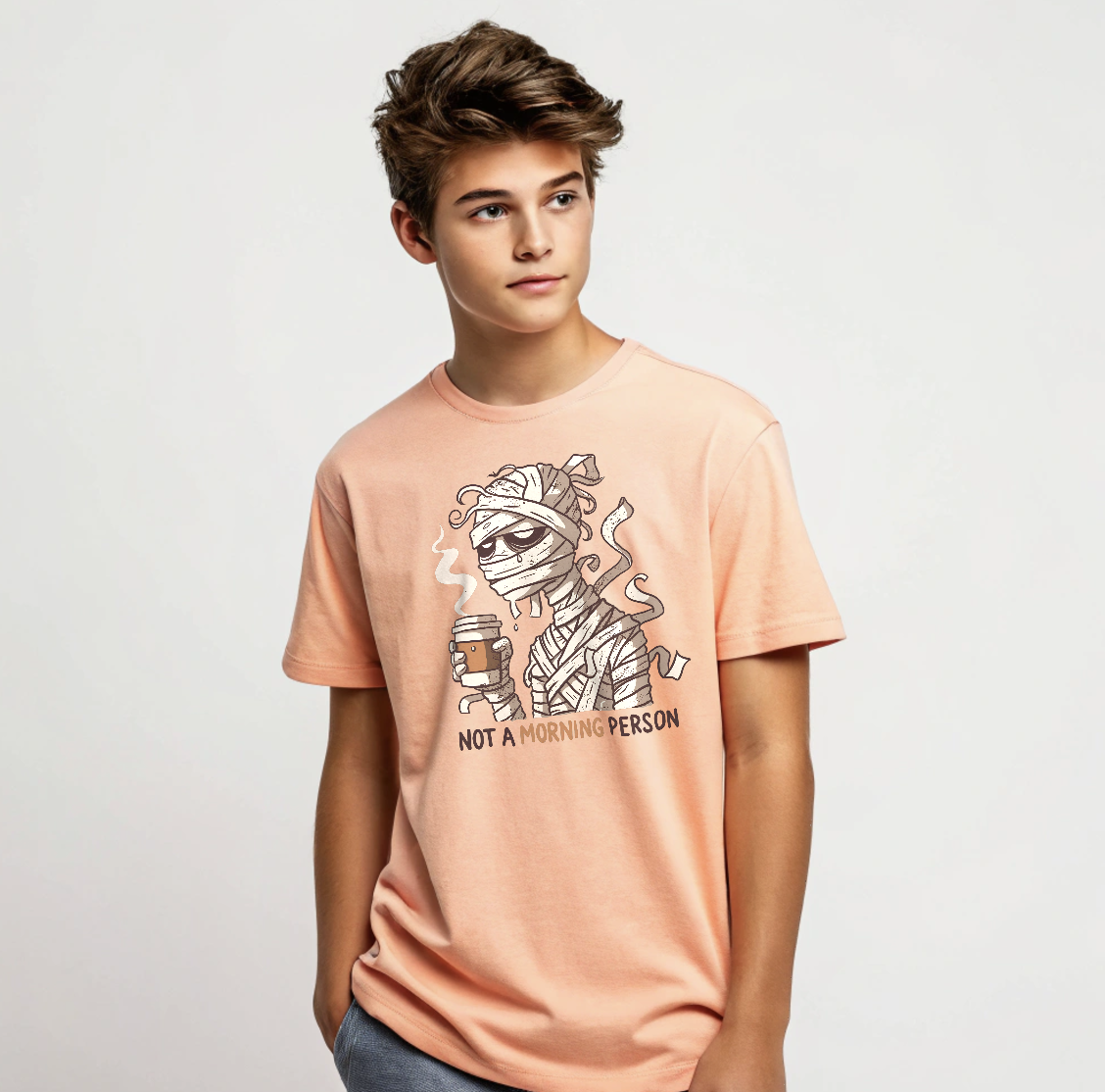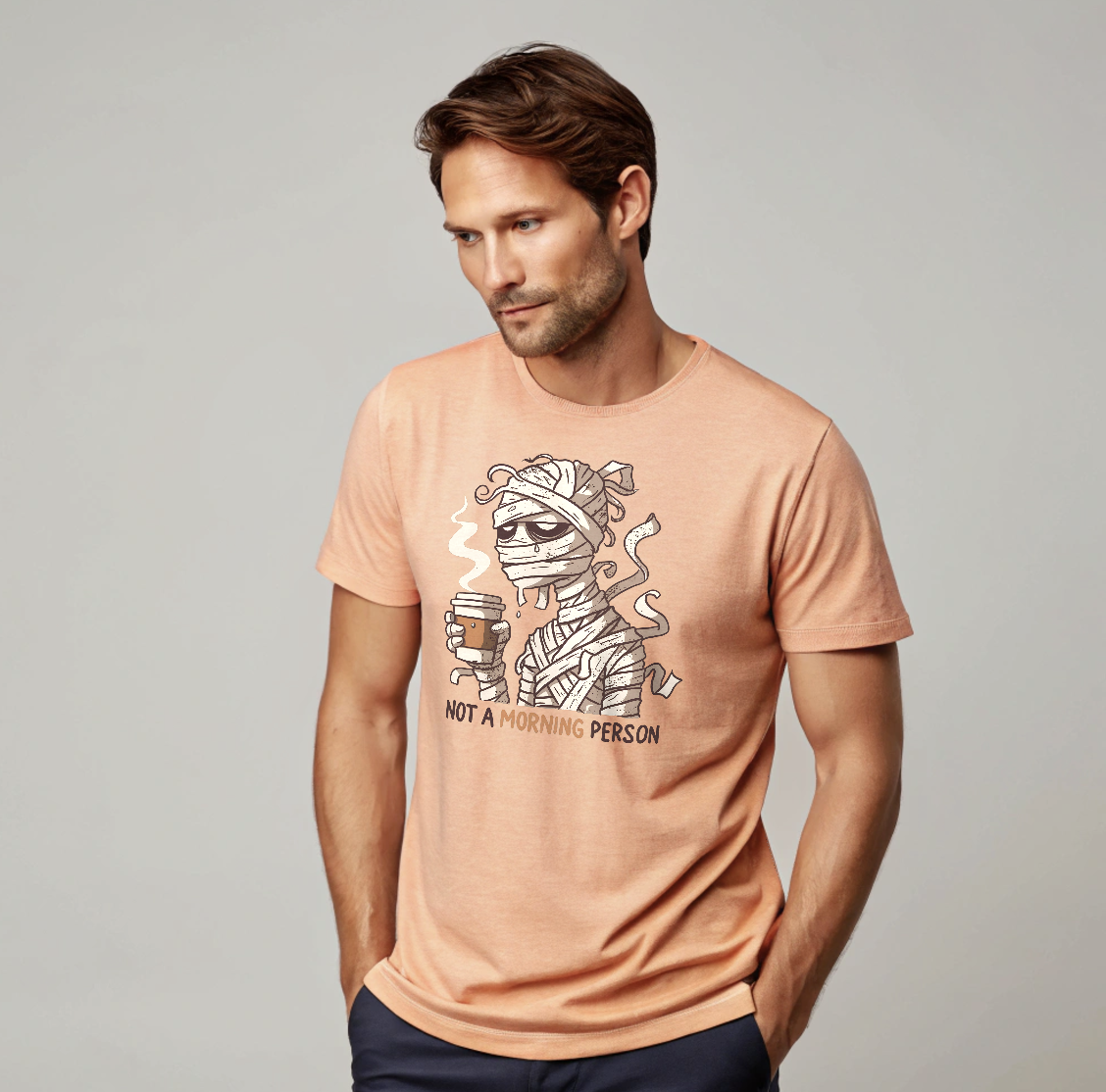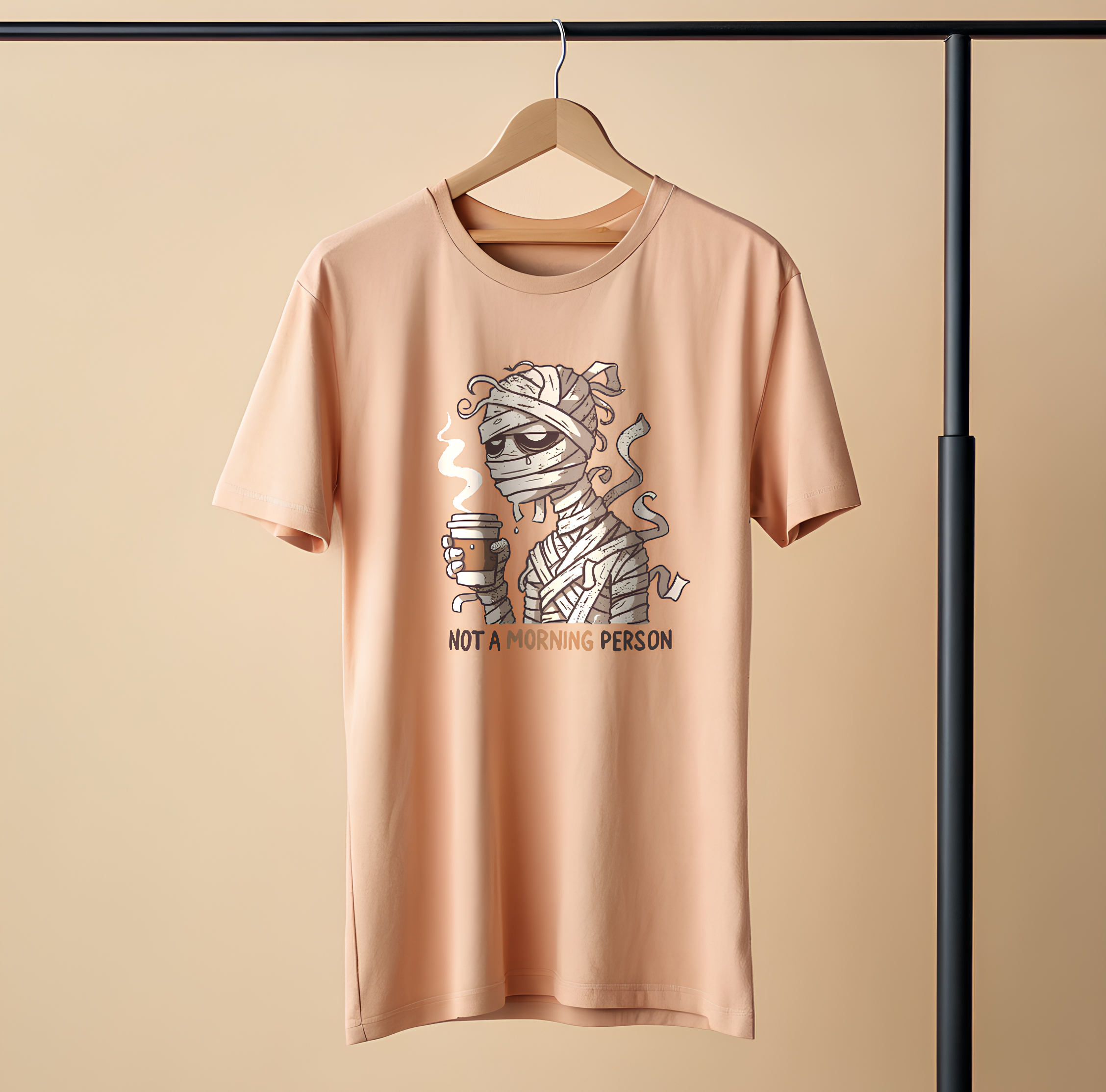 Start your day with a dose of humour and comfort! This “Not a Morning Person” T-shirt features a quirky cartoon mummy clutching a steaming hot coffee — perfectly capturing the struggle of early mornings. Whether you’re a night owl, a late riser, or just someone who needs coffee before functioning, this tee lets your personality speak for you.