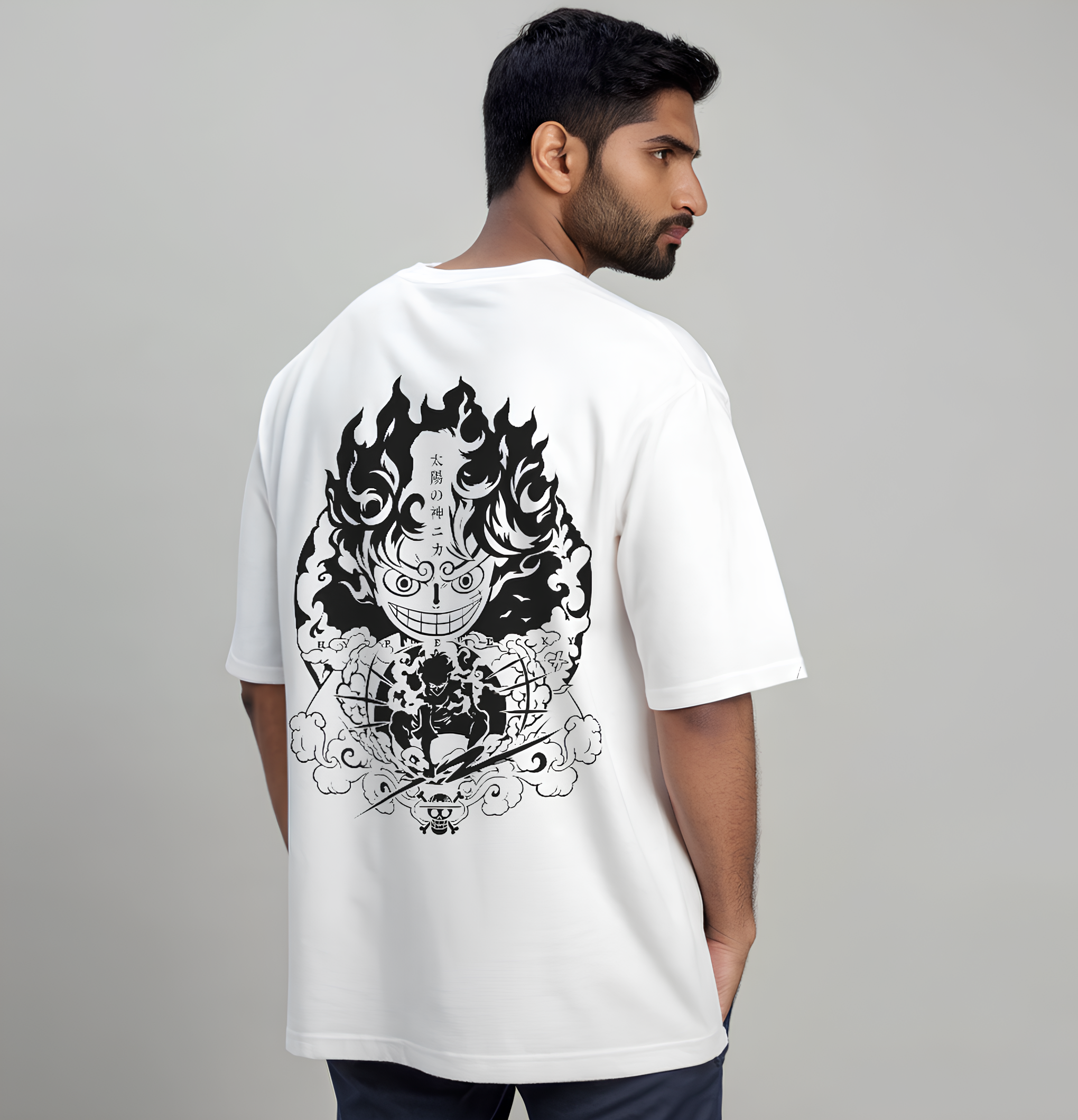 The design features an intense monochrome artwork showcasing a fiery, mythical character surrounded by swirling smoke, dynamic line art, and symbolic elements. The bold black-on-white composition creates powerful visual impact, making this tee perfect for anime fans, graphic-art lovers, and anyone who appreciates detailed, expressive illustrations. Each stroke in the artwork is sharp and clean, giving the print depth and character without overwhelming the minimal aesthetic of the overall outfit.