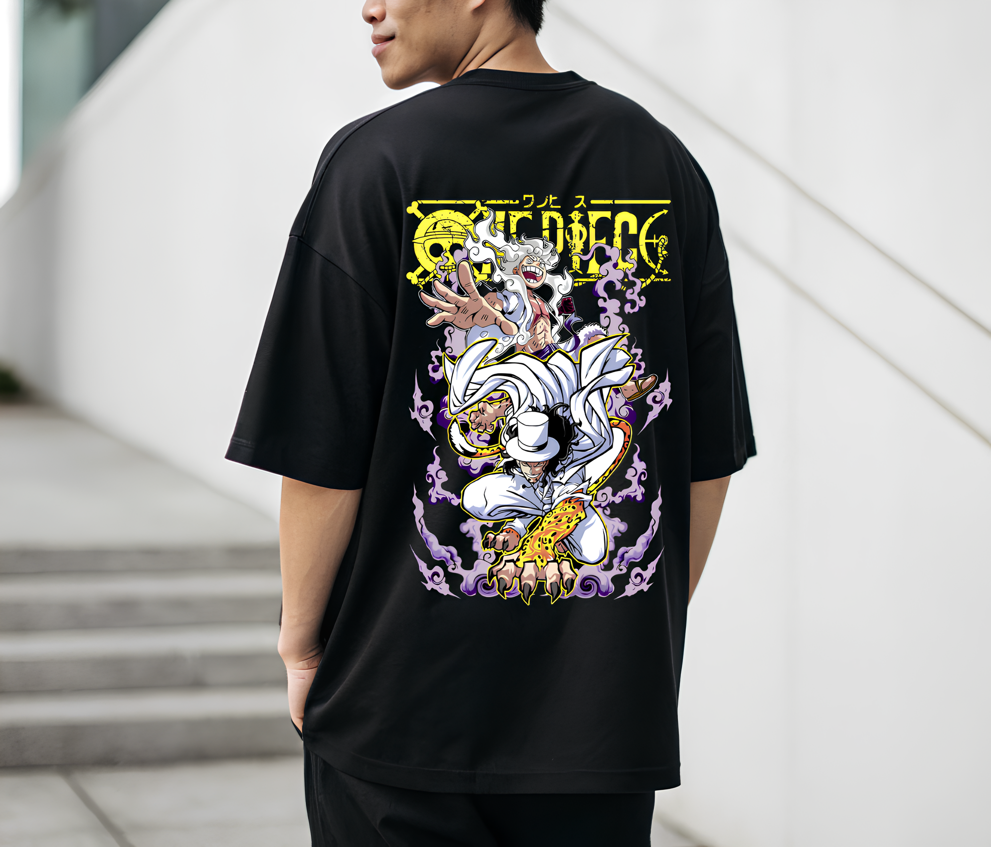Back Print Version: A statement piece featuring a vibrant full-back graphic of epic One Piece characters in action, framed with striking Japanese typography and glowing effects.