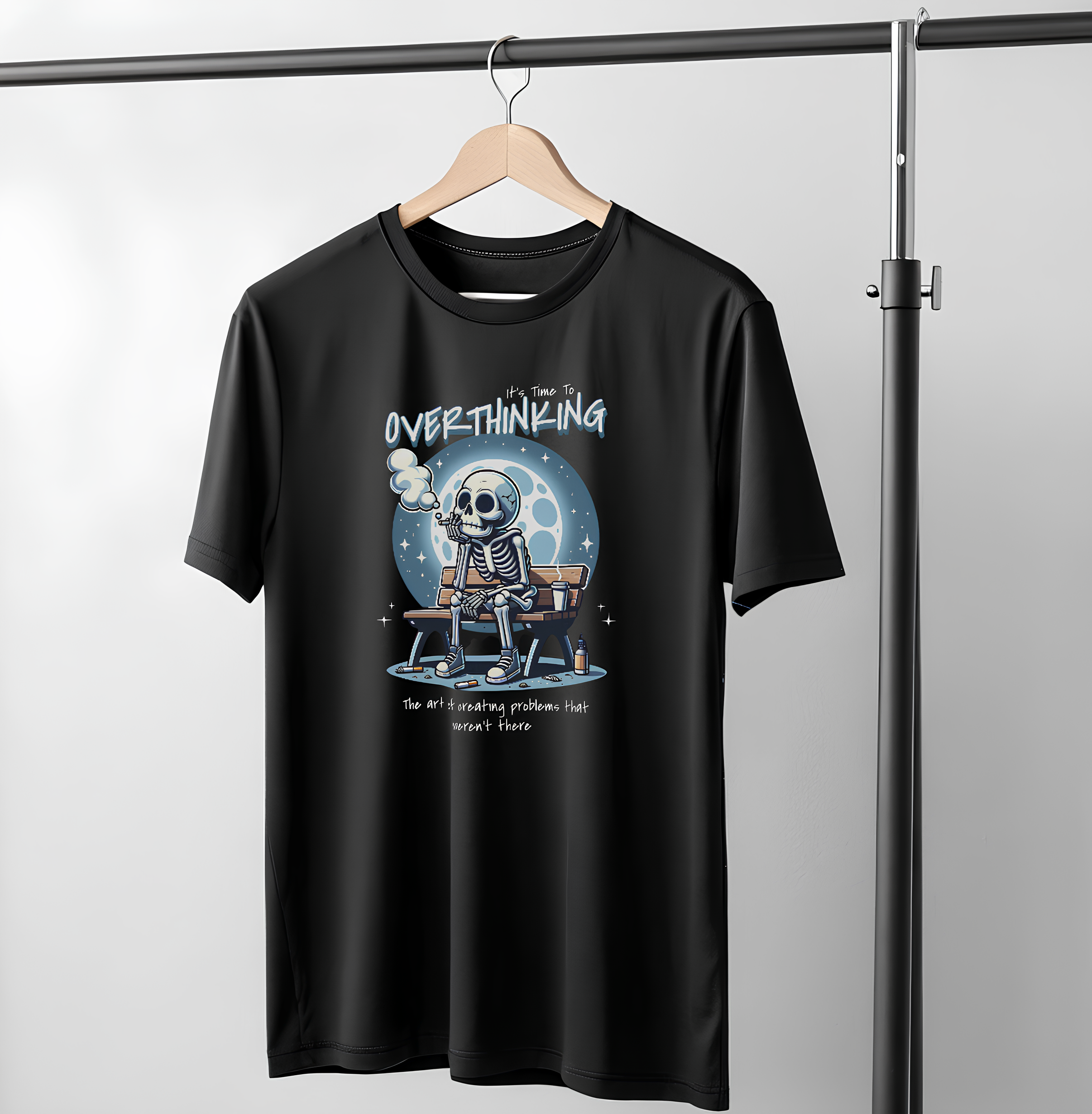• Turn your late-night thoughts into a statement with this “Overthinking” Graphic T-Shirt — a witty, relatable design made for deep thinkers, creatives, and anyone whose mind never hits the pause button.
