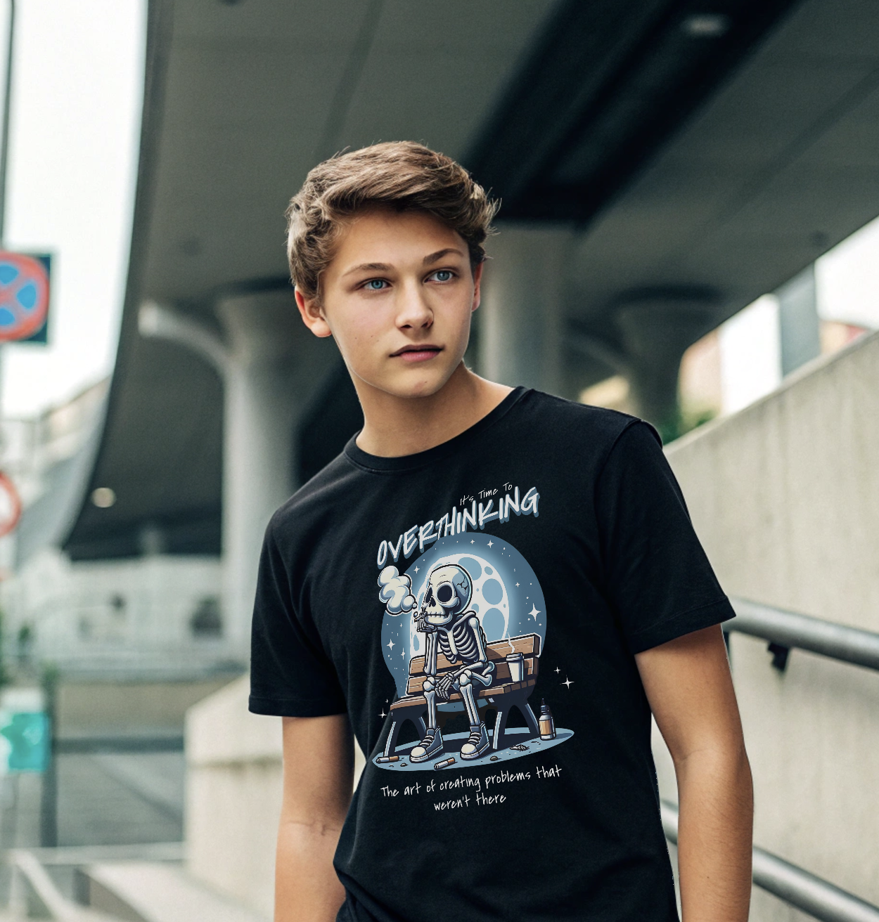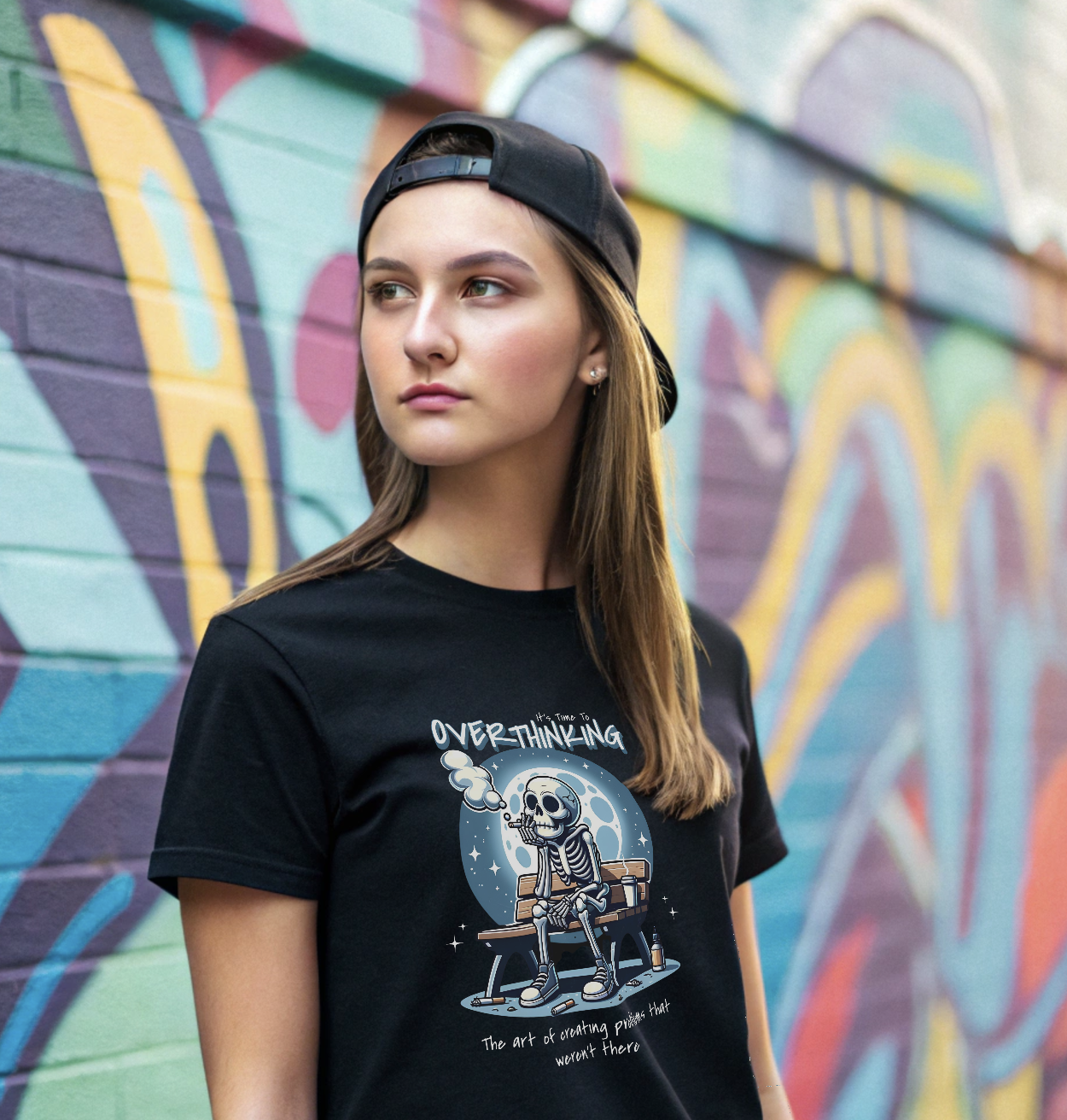 The artwork features a laid-back skeleton sitting on a park bench under a glowing moon, cigarette smoke drifting upward as the universe quietly watches. Paired with the bold headline “It’s Time To OVERTHINKING” and the clever line “The art of creating problems that weren’t there,” this tee blends dark humor, self-awareness, and modern cartoon style into one eye-catching design.