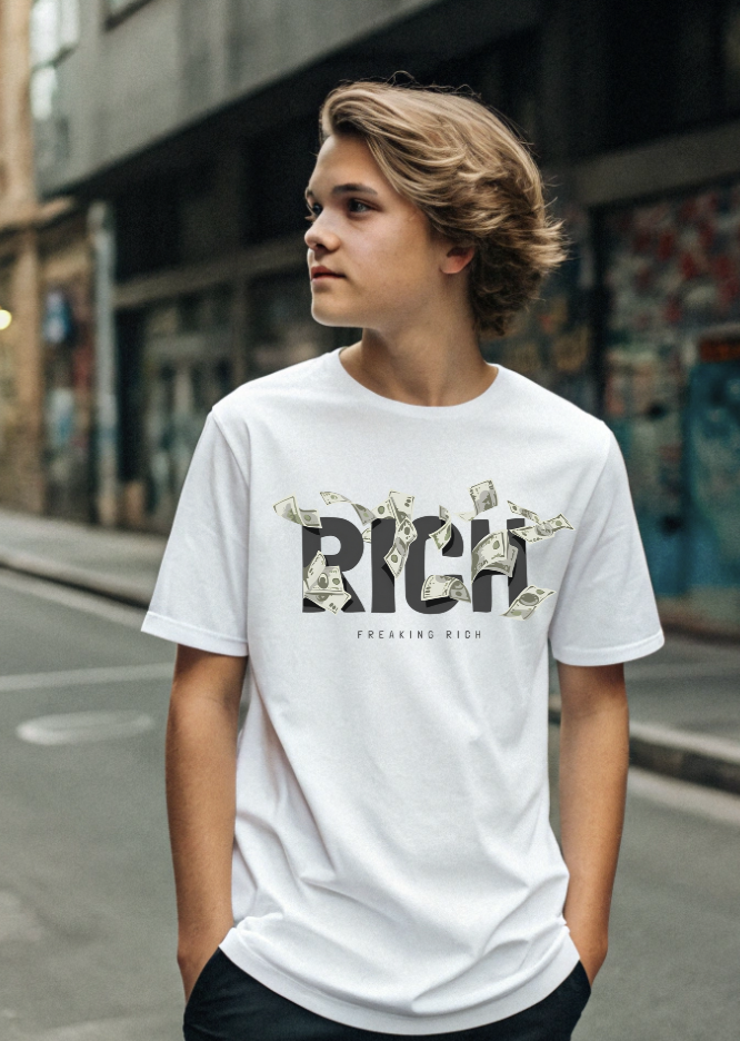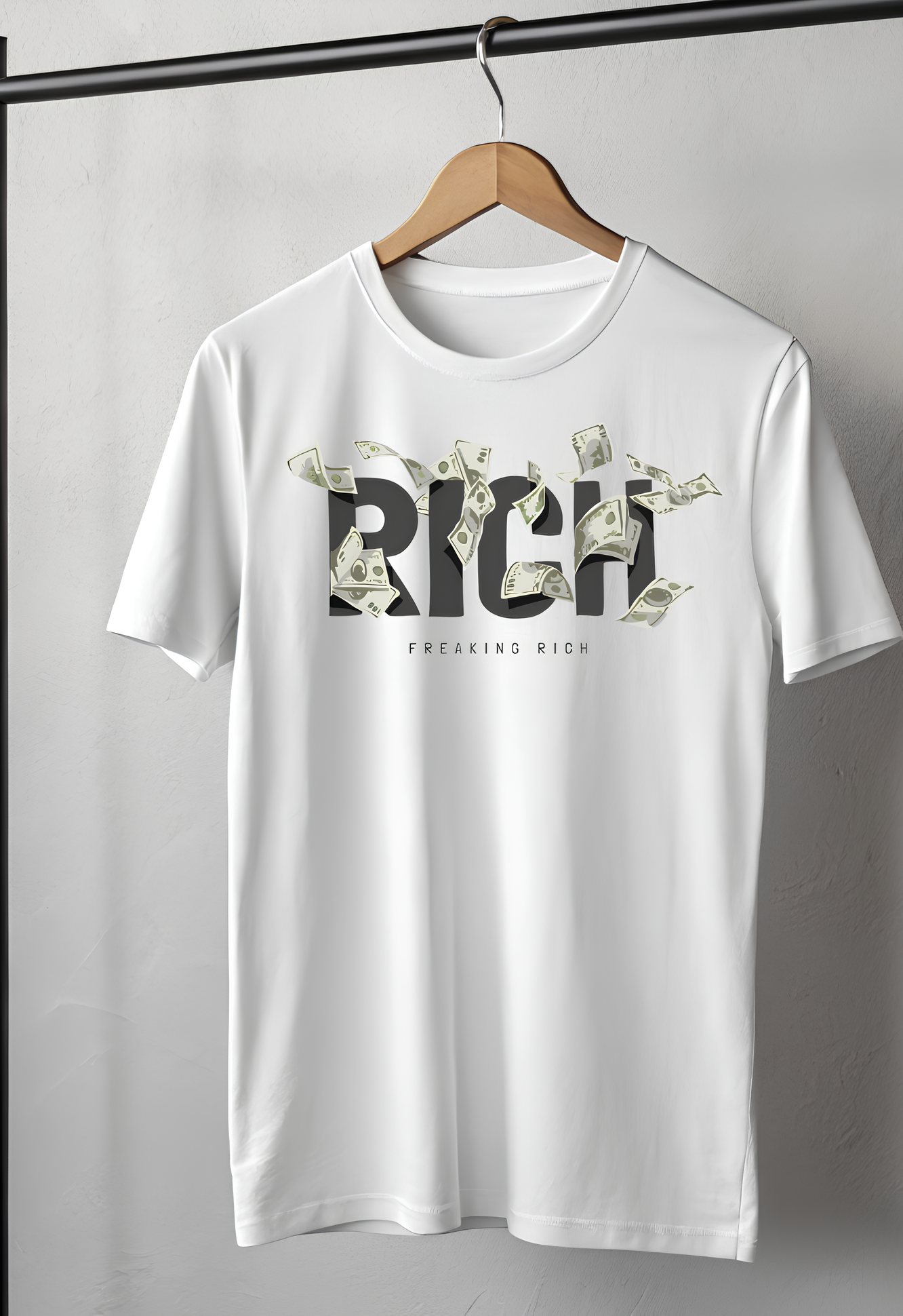 • Step into a lifestyle of confidence and bold ambition with our “Freaking Rich” Premium Graphic T-Shirt. Designed for those who dream big and hustle harder, this standout piece features a striking graphic where the bold word “RICH” is brought to life with illustrated dollar bills bursting through the letters—symbolizing abundance, success, and an unapologetic mindset of prosperity.