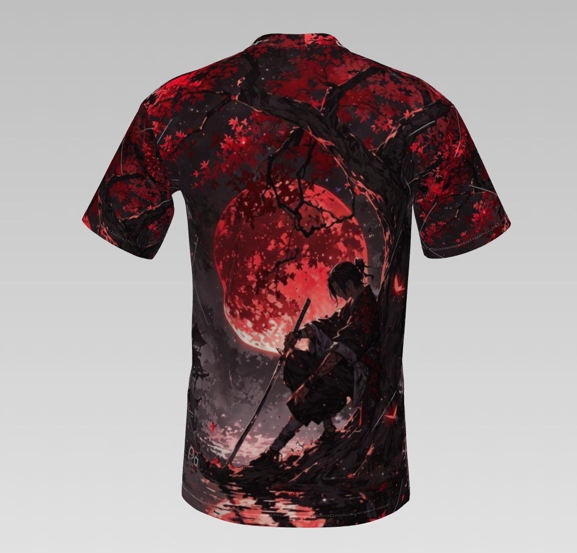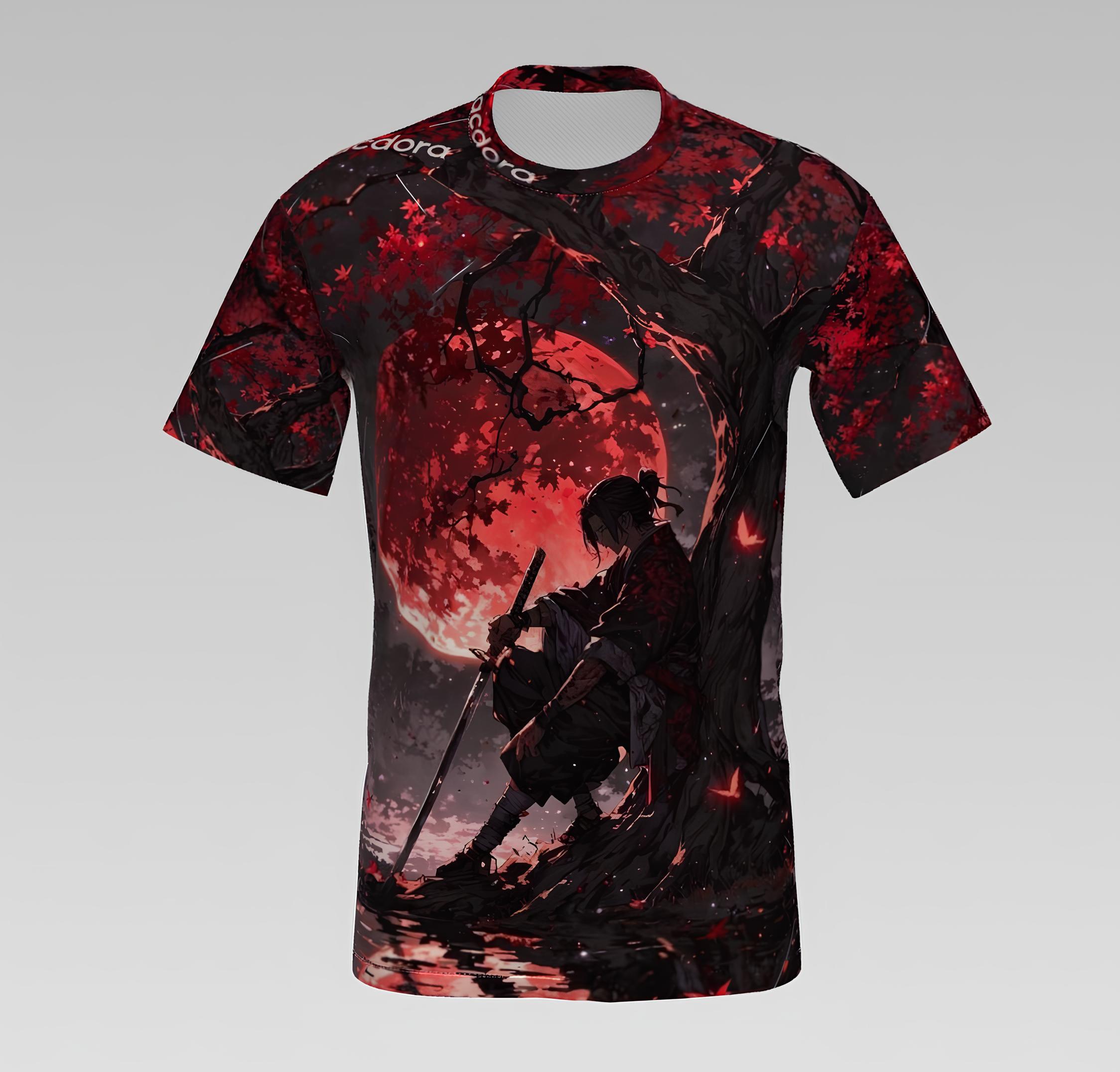 - Step into the realm of mystery and strength with the Samurai Moon Shadow T-shirt — a stunning blend of art, culture, and attitude. This all-over print tee captures the silhouette of a lone samurai meditating beneath a crimson moon and autumn tree, symbolizing discipline, honor, and inner peace. The dramatic red-and-black color palette evokes a sense of intensity and depth, making it a true statement piece for any anime, samurai, or Japanese art enthusiast.