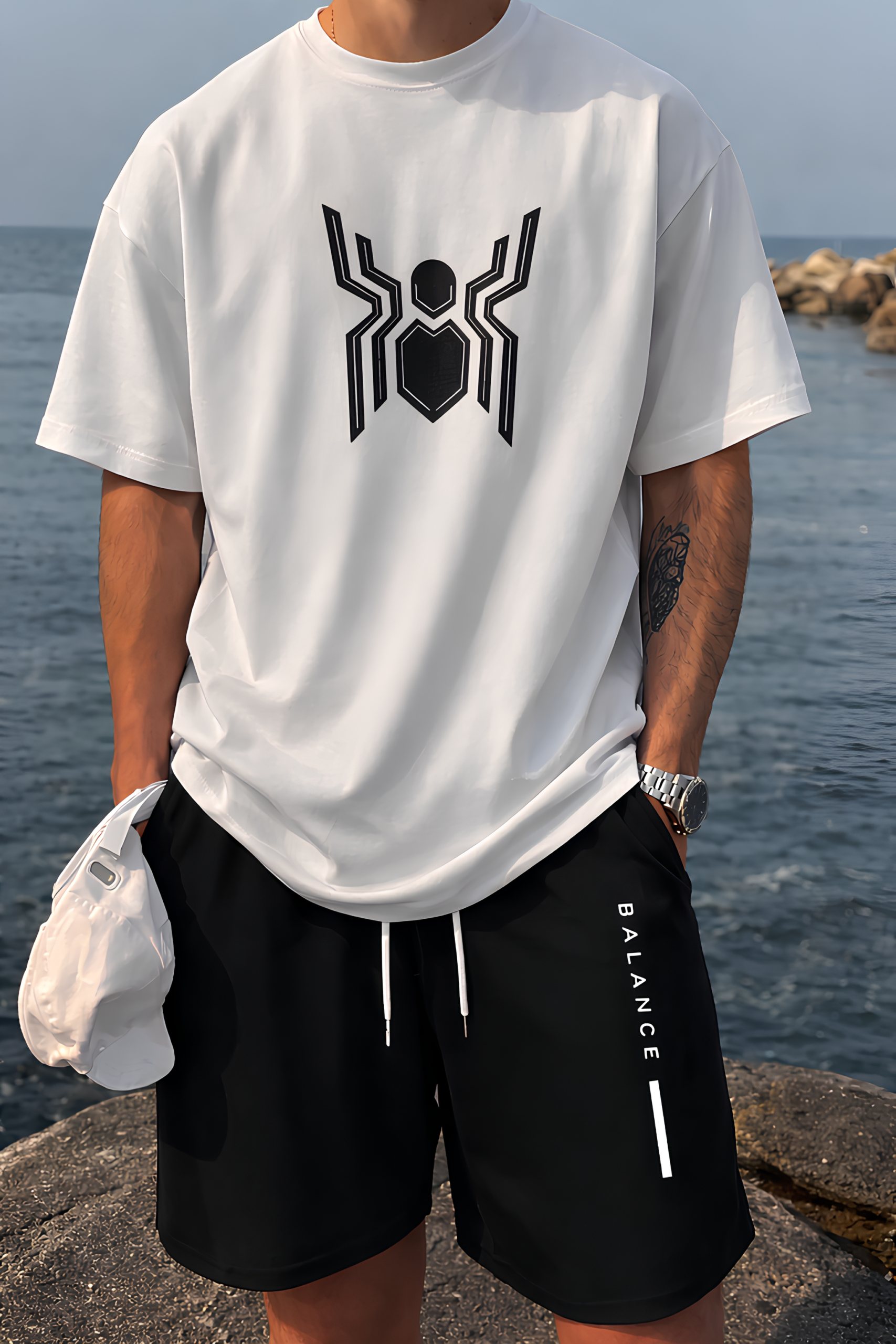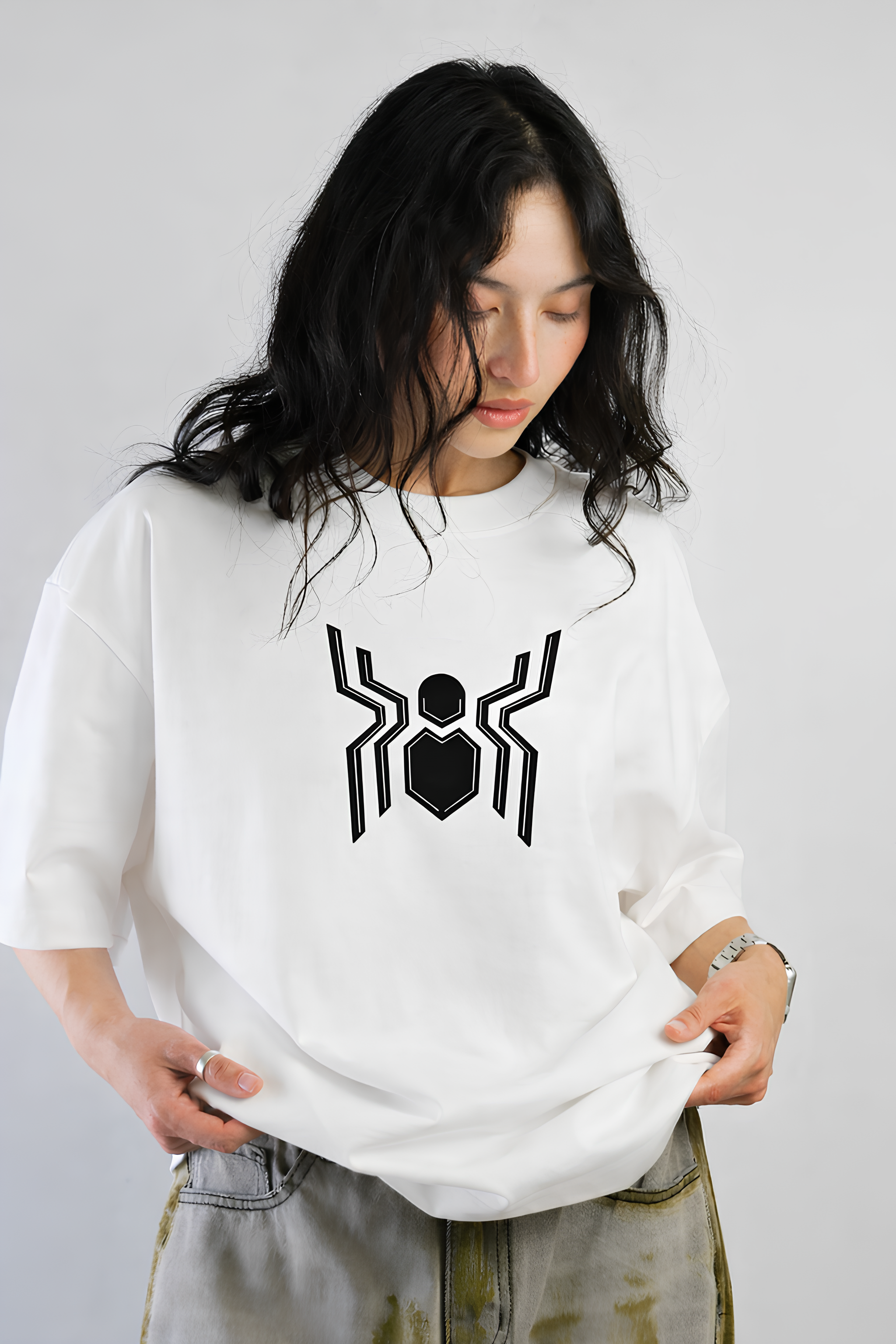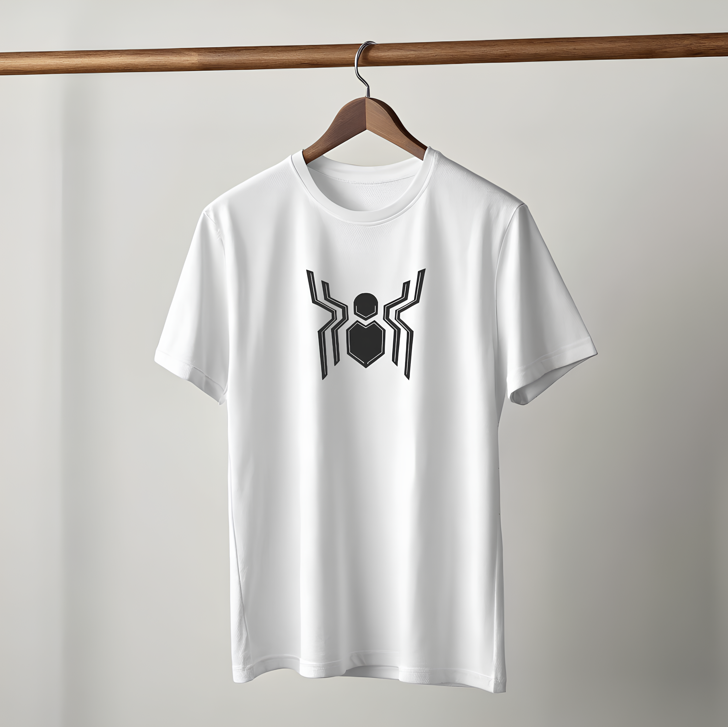 The sharp, symmetrical lines of the spider graphic create a futuristic and edgy vibe, making this T-shirt perfect for streetwear lovers, comic fans, and anyone who enjoys distinctive graphic apparel. The high-contrast black design stands out beautifully against the crisp white fabric, ensuring the artwork remains the focal point of the piece.