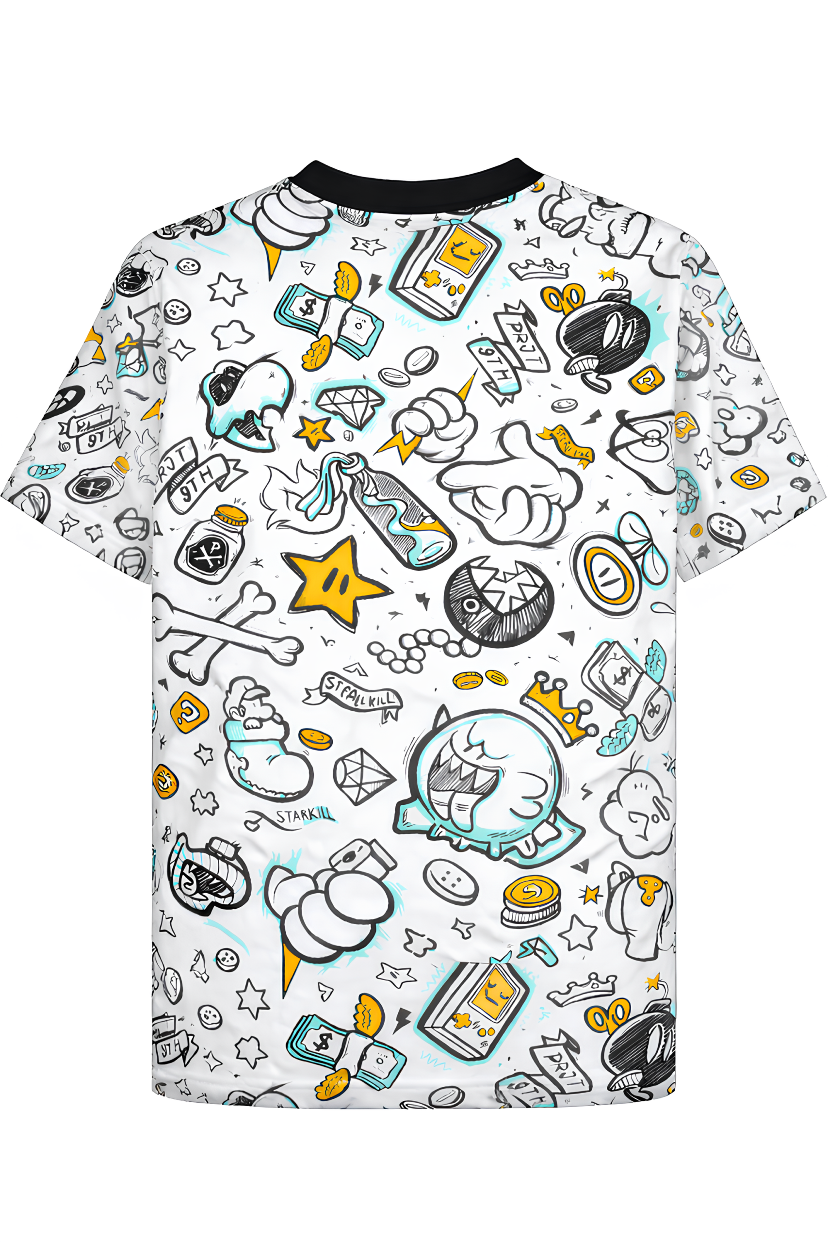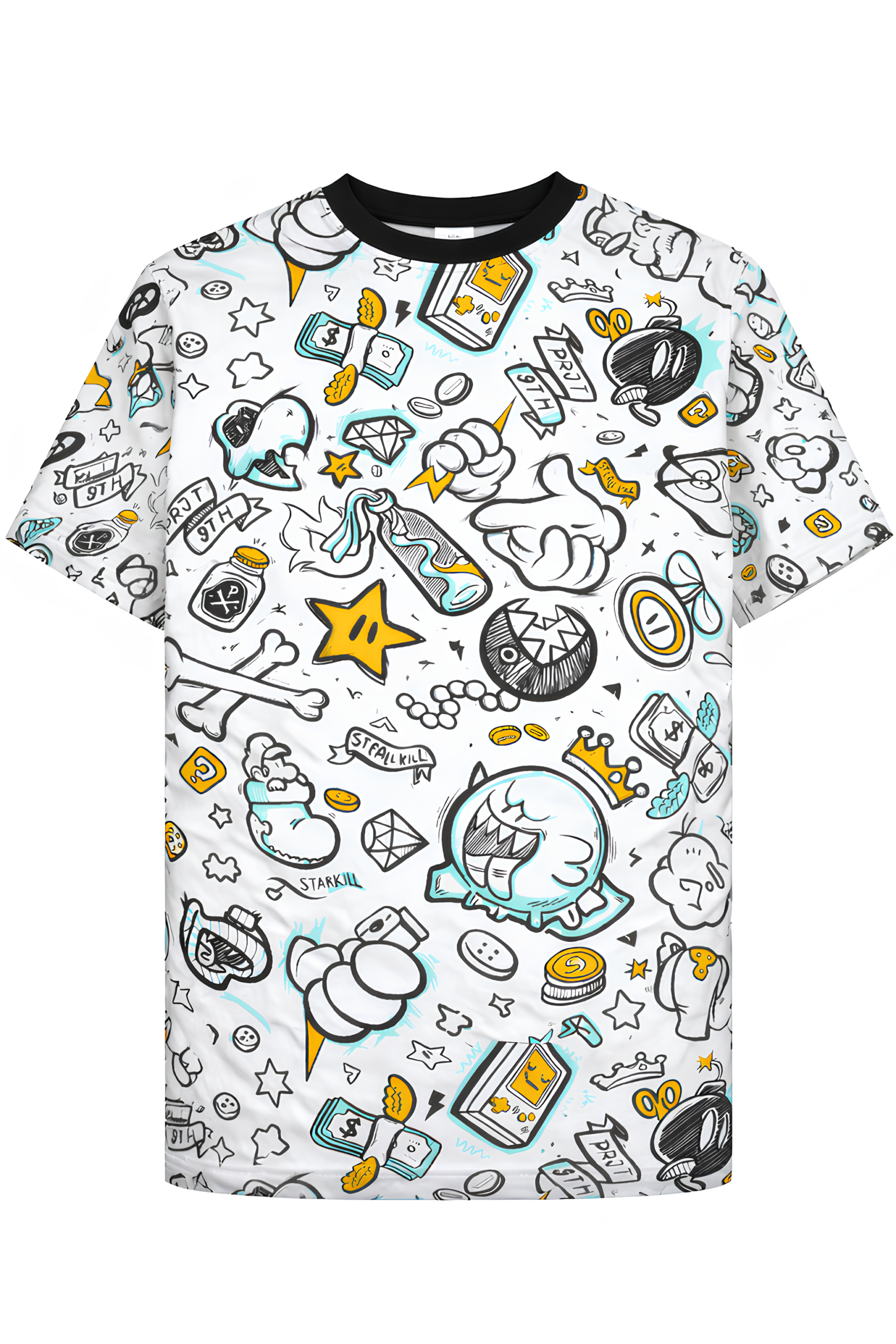 Make a bold statement with this eye-catching all-over print T-shirt designed for trendsetters who love expressive streetwear. Featuring a playful graffiti-inspired doodle pattern in black, teal, yellow, and grey tones, this shirt blends urban culture with fun cartoon energy.