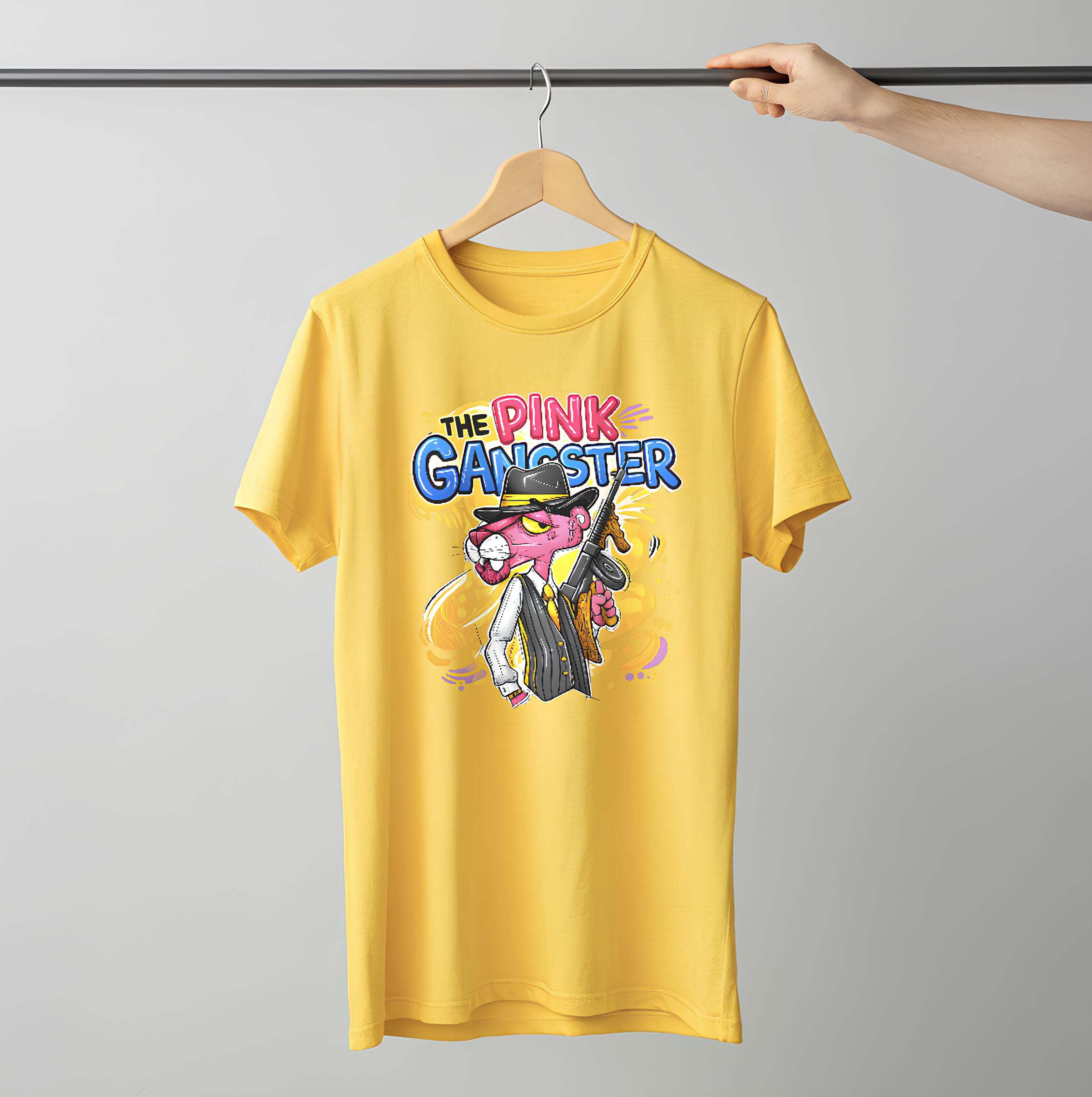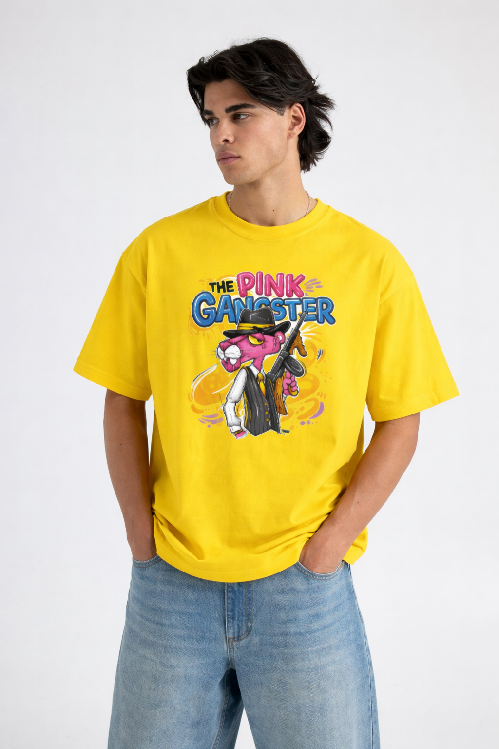 Featuring a striking cartoon gangster panther illustration paired with bold typography, this tee blends urban swagger with playful artistry. The bright yellow base makes the artwork pop, giving you a standout look whether you’re on the streets, at a casual hangout, or creating content for your socials.