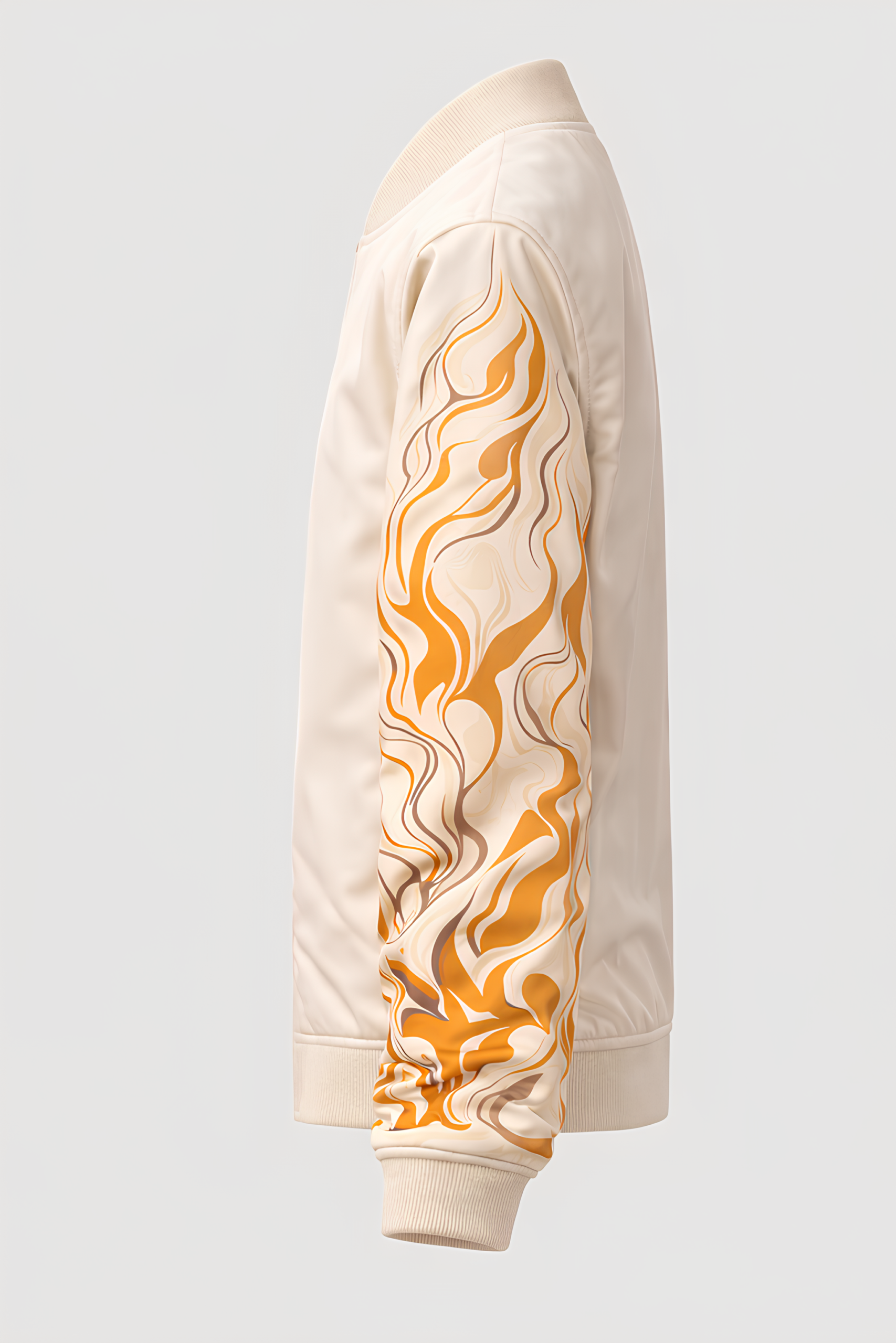 Both sleeves feature flowing flame-style graphics in warm orange and caramel tones, creating movement and energy along the arms.