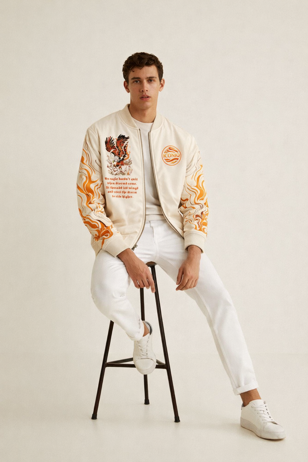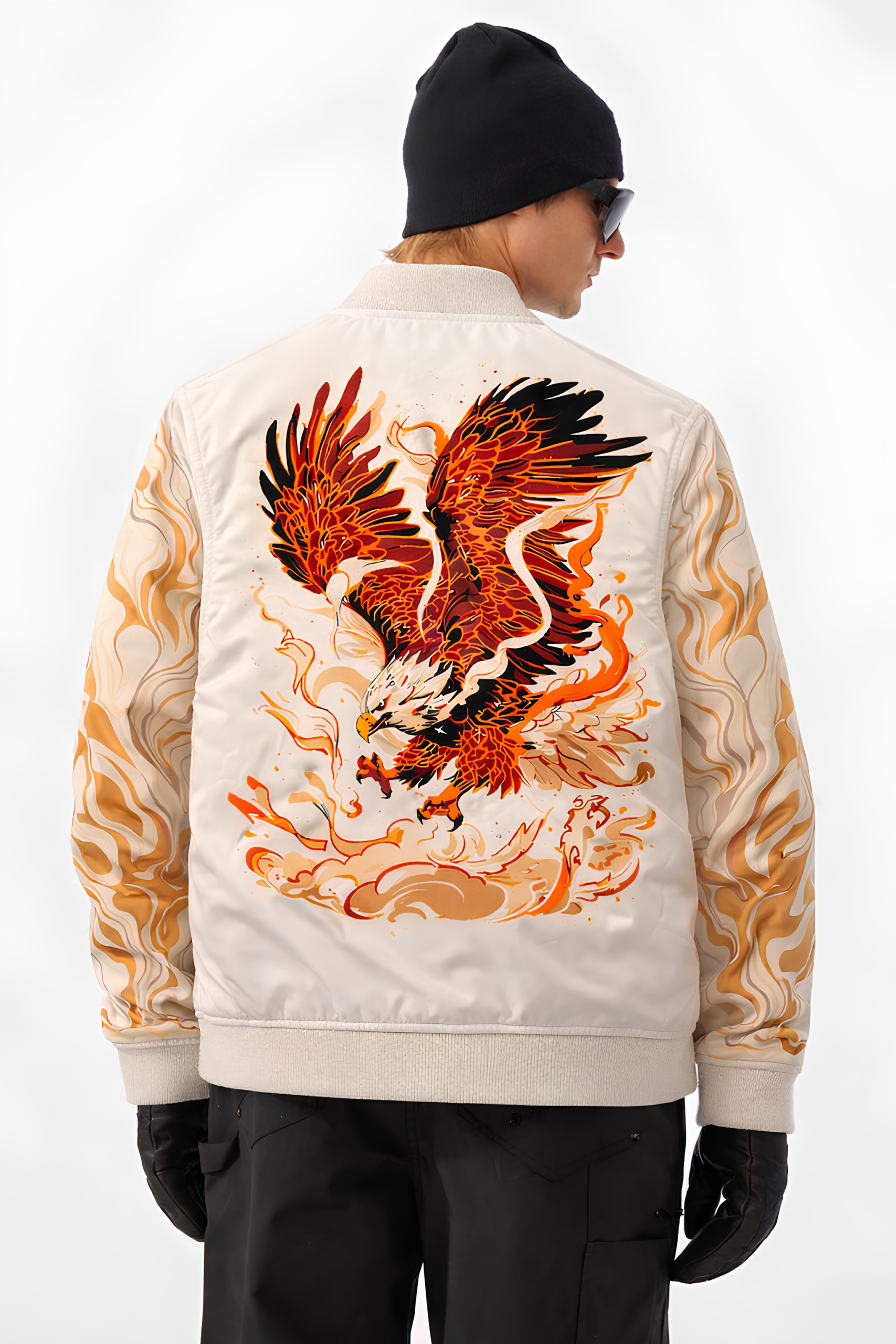 Crafted in a premium creamy off-white color, the clean base enhances the fiery artwork and gives the jacket a modern, sophisticated streetwear look.