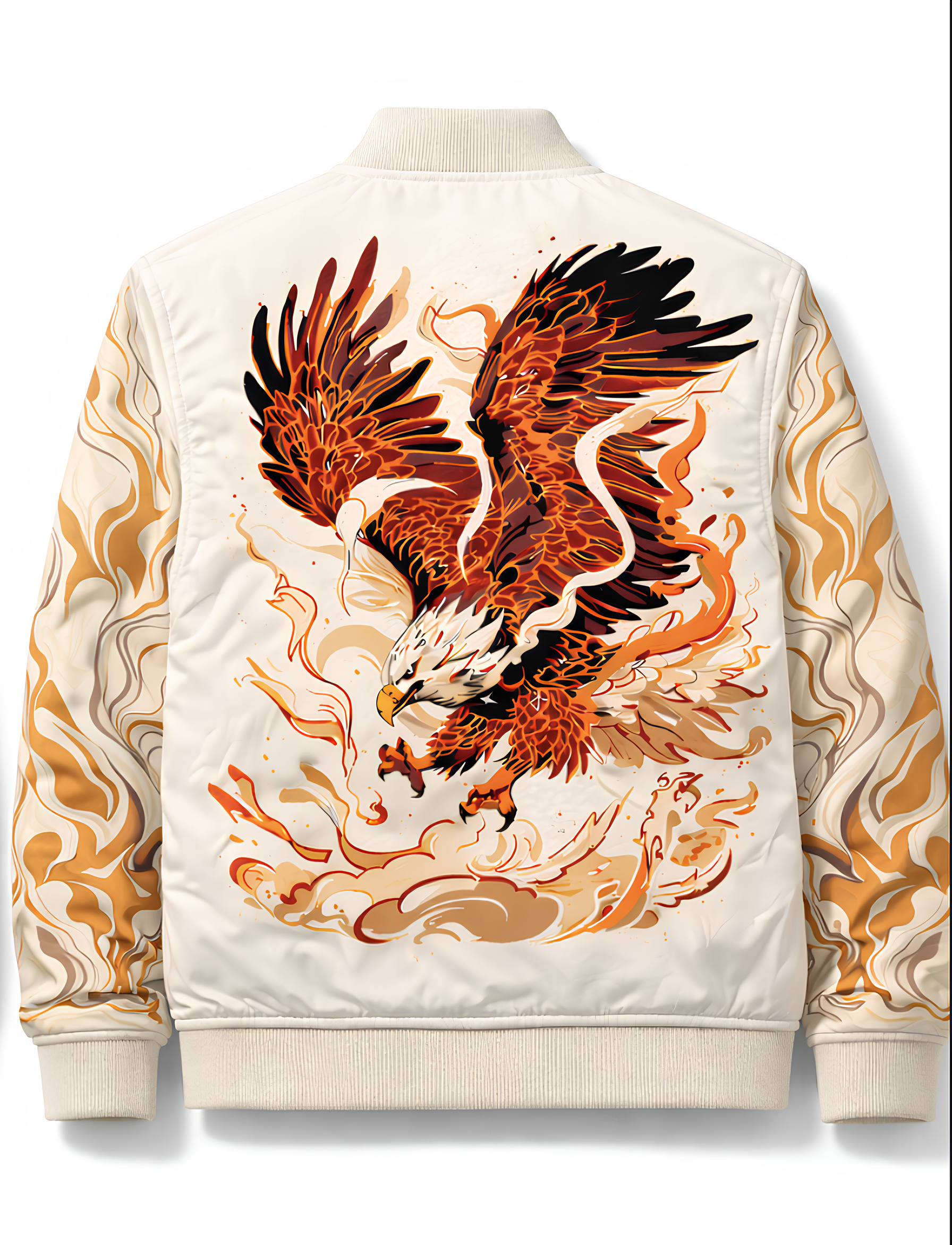 The centerpiece of the jacket is the striking eagle illustration on the back, captured mid-flight with wings spread wide in a powerful pose. Surrounded by swirling flames and energy, the eagle symbolizes strength, leadership, and the courage to face every storm.