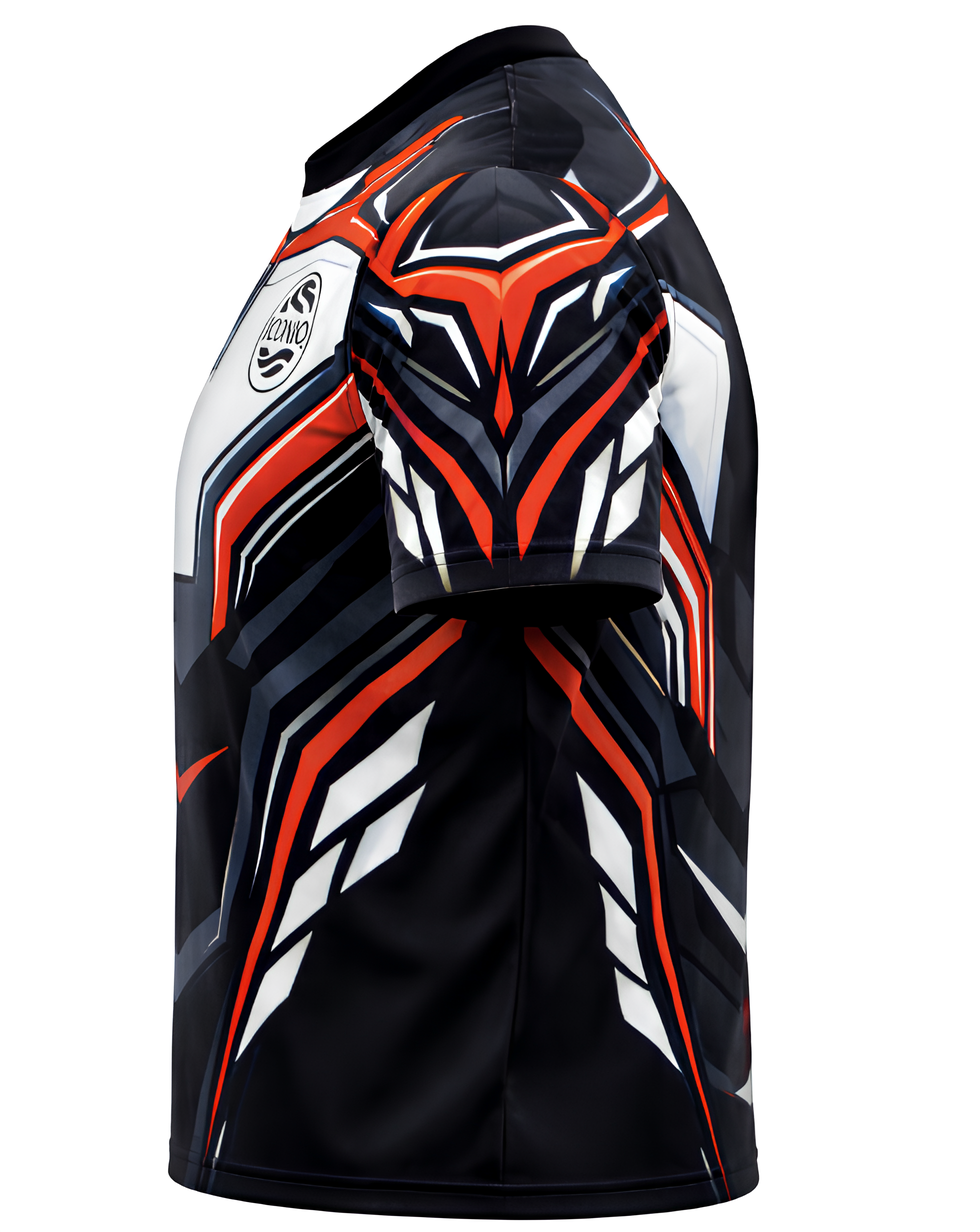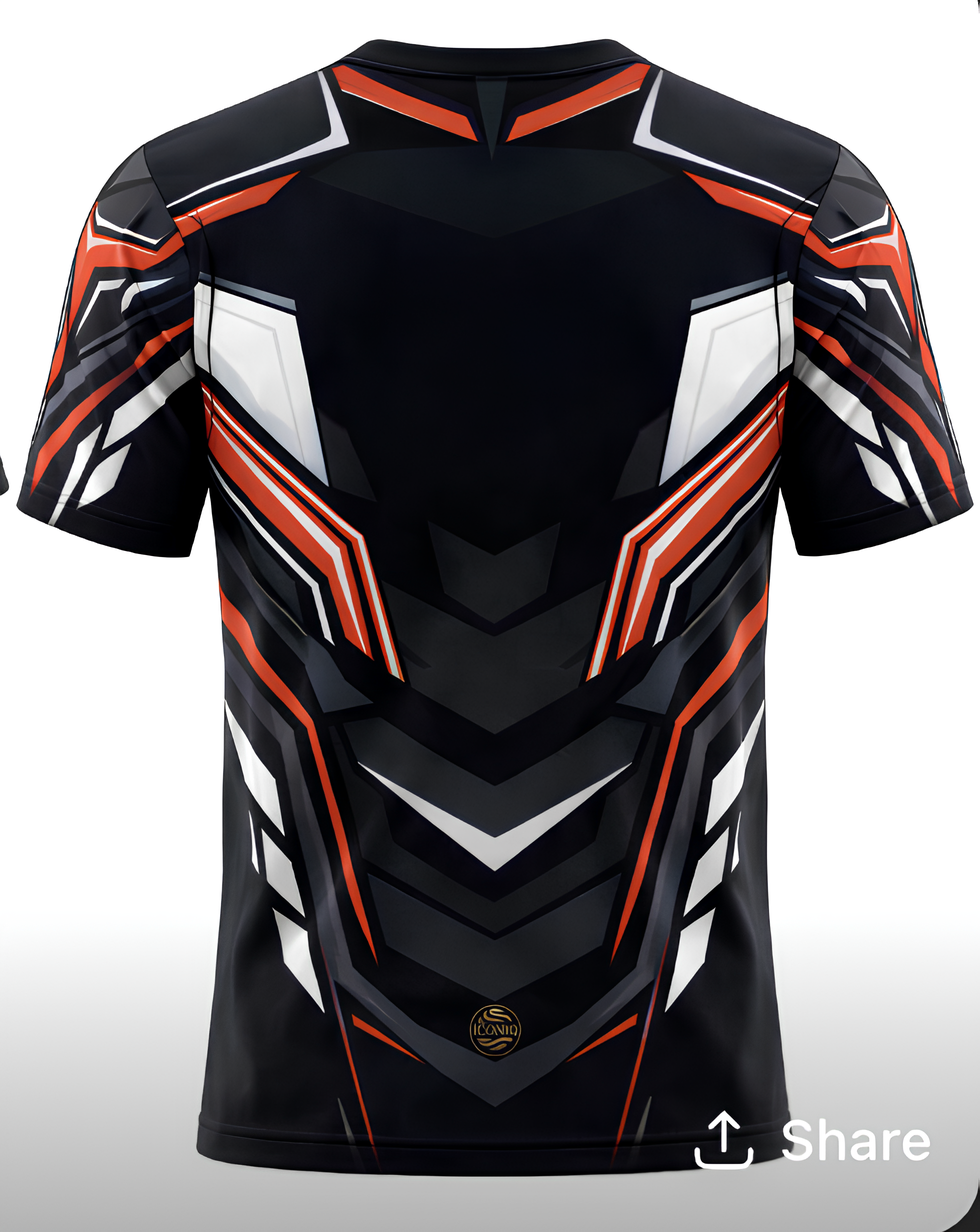 The design features a striking angular armor-style graphic that flows seamlessly across the front, sleeves, and back of the shirt. Bold red accents cut through deep black and white panels, creating a sharp geometric pattern that enhances movement and gives the shirt a powerful, futuristic appearance. The ICONIQ logo placed on the chest adds a premium branded touch while maintaining a clean and balanced design.