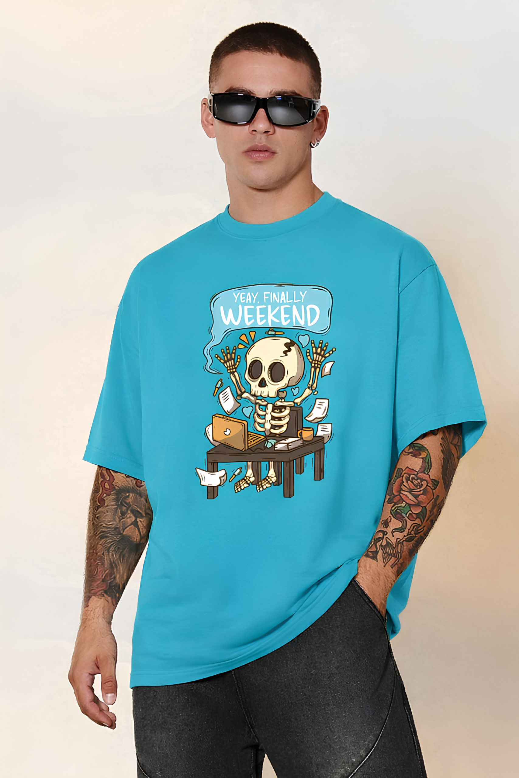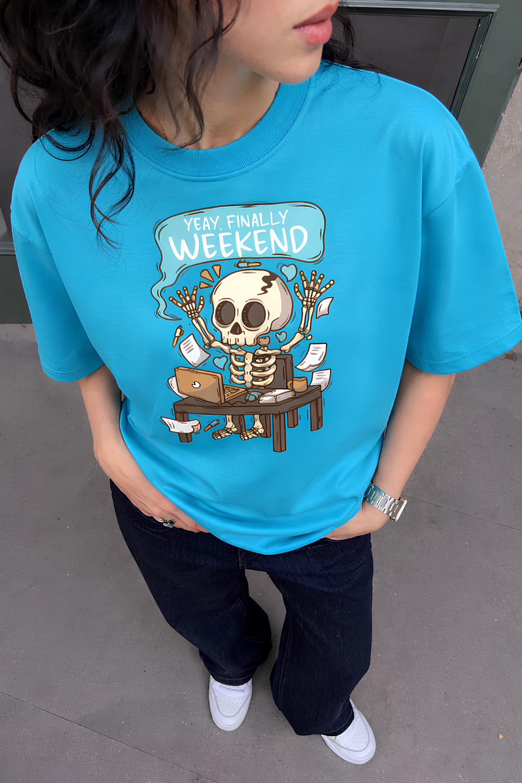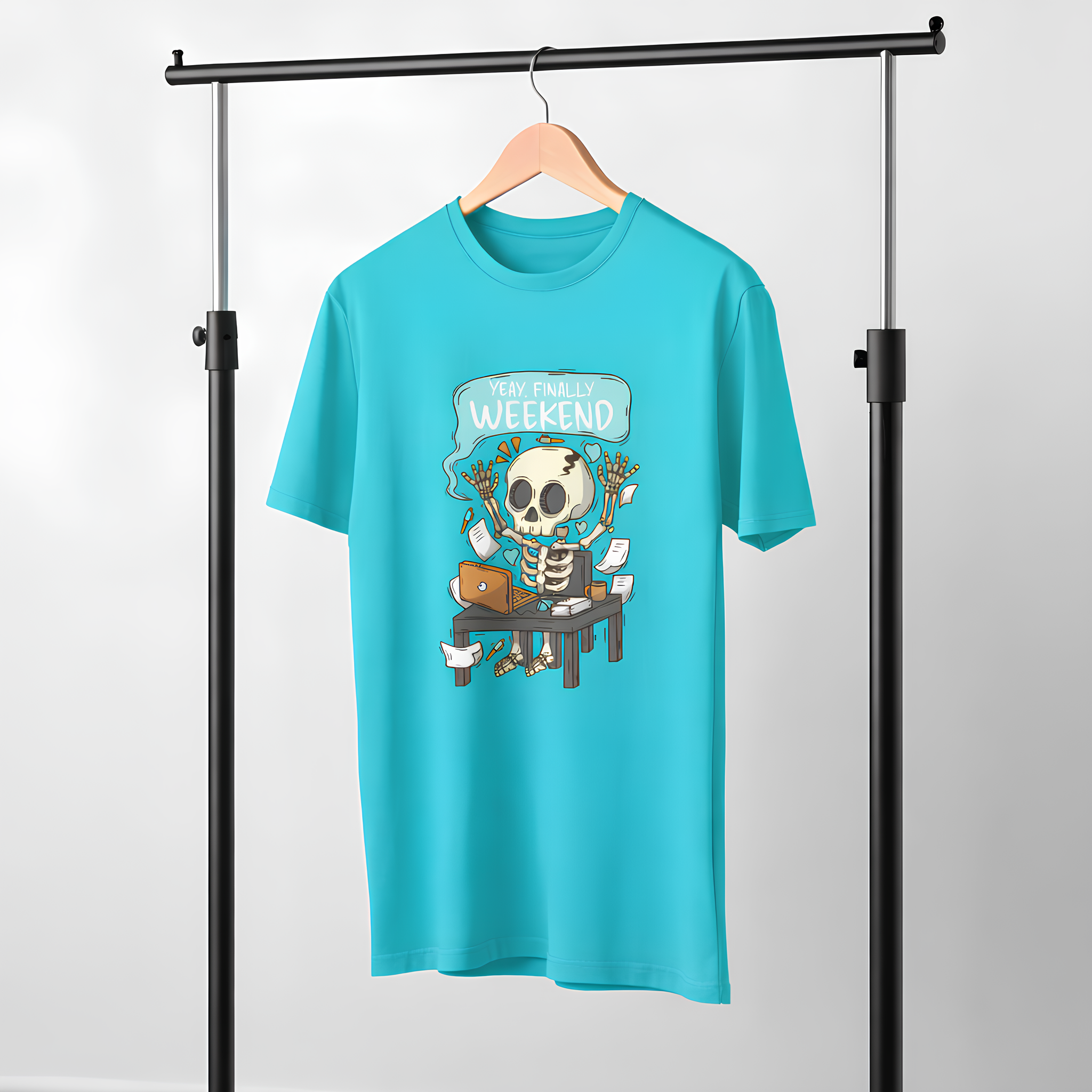 Celebrate the best part of the week with this fun and eye-catching “Yeay, Finally Weekend” Skeleton T-Shirt. Designed with a playful cartoon skeleton sitting at a work desk surrounded by flying papers, this graphic tee perfectly captures the excitement of finishing a busy week and welcoming the weekend in style. The vibrant turquoise color adds a fresh and energetic touch, making it a standout piece in any casual wardrobe.